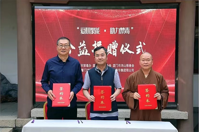 厦门市禁毒协会副会长、秘书长黄剑平;市禁毒协会荣誉会长、华懋(厦门) 特种材料有限公司董事长叶激艇;福建省政协委员、厦门市鸿山慈善会会长法云大和尚共同签订爱心捐赠协议。
