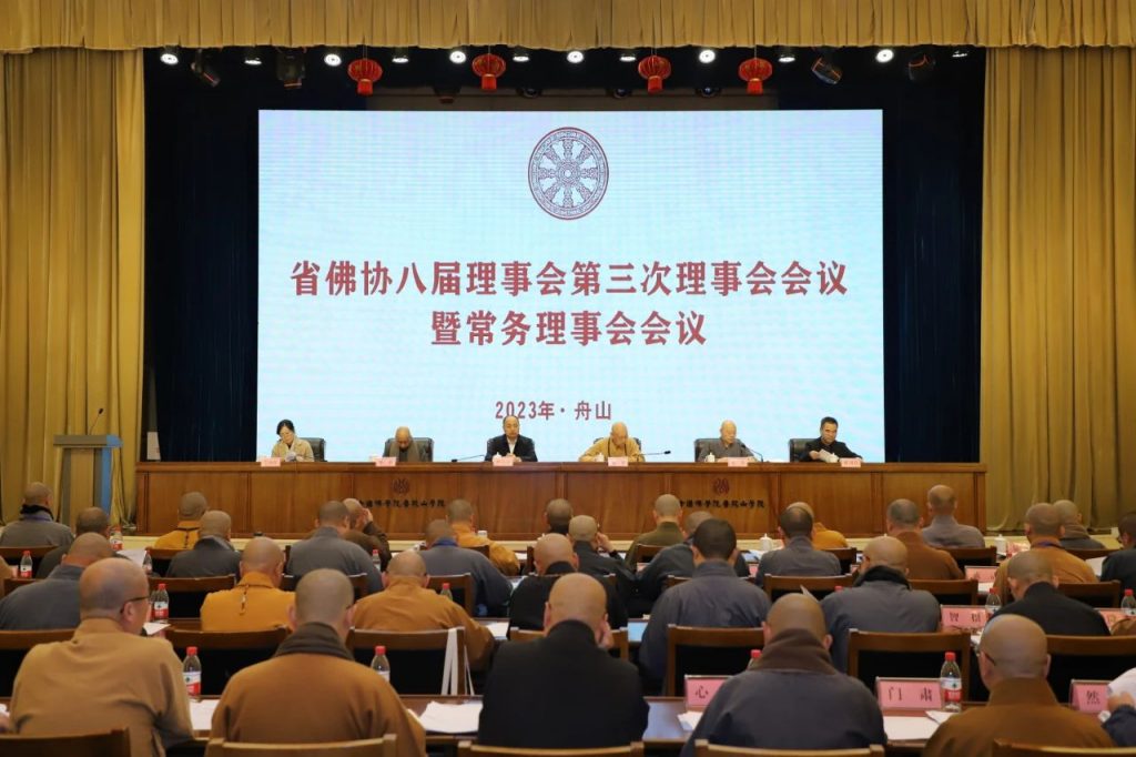 2023年3月29日至30日,浙江省佛教协会八届理事会第五次会长会议、第三次理事会暨常务理事会会议在舟山(中国佛学院普陀山学院)召开。浙江省民宗委副主任钟新章应邀出席会议并讲话,浙江省民宗委党组成员、省委统战部民宗处处长毛秋红,浙江省民宗委宗教一处处长楼剑涛莅会指导。