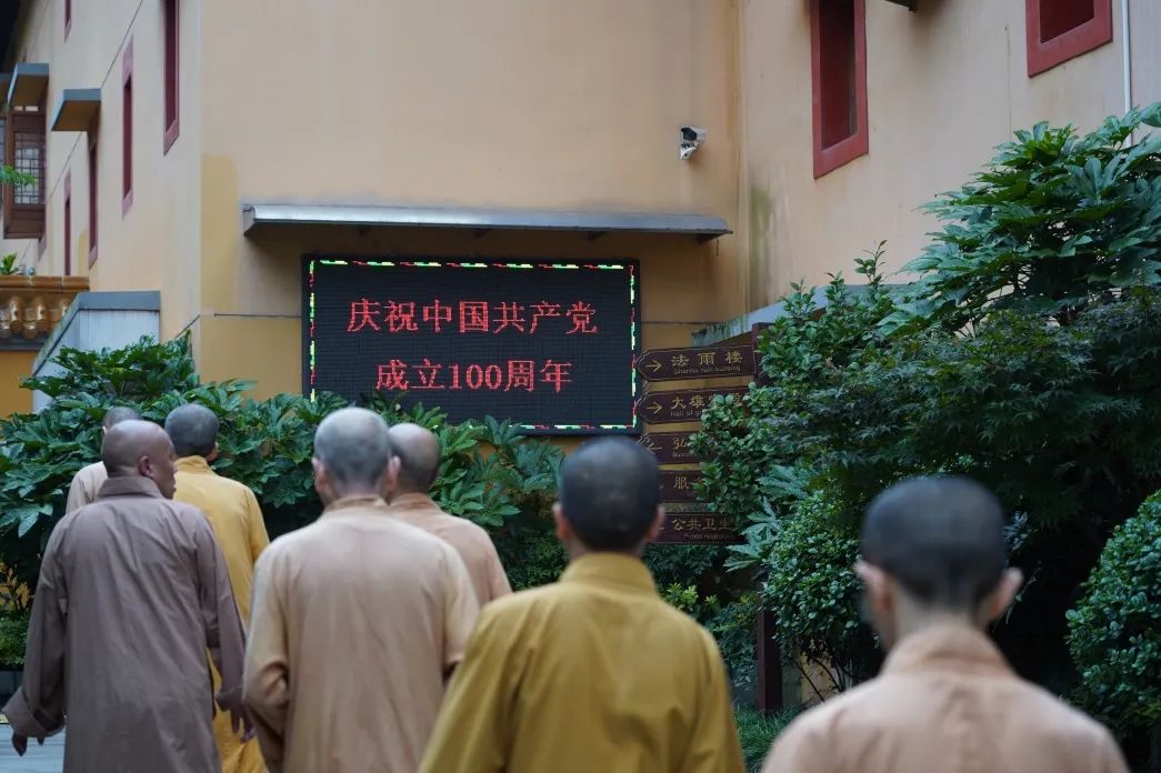 为庆祝中国共产党成立100周年,2021年7月1日上午7时50分,上虞多宝讲寺隆重举行庄严的升国旗仪式。