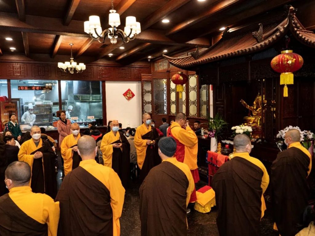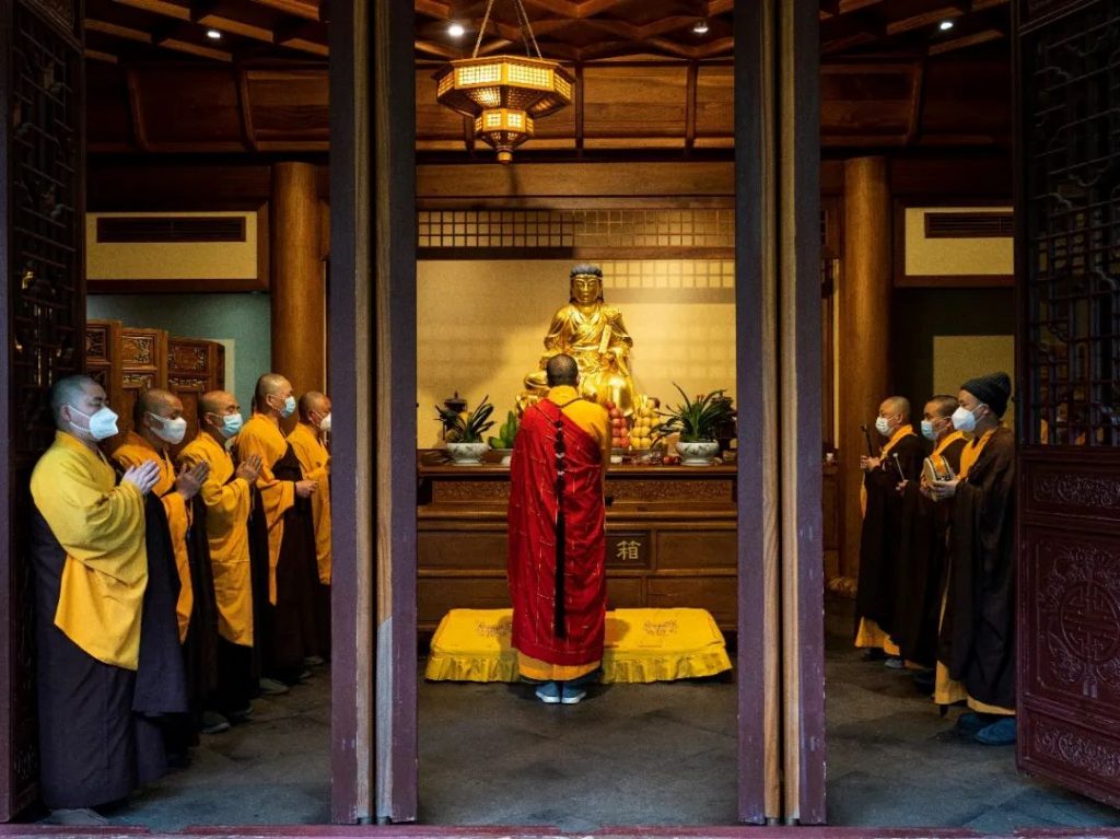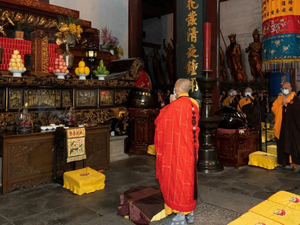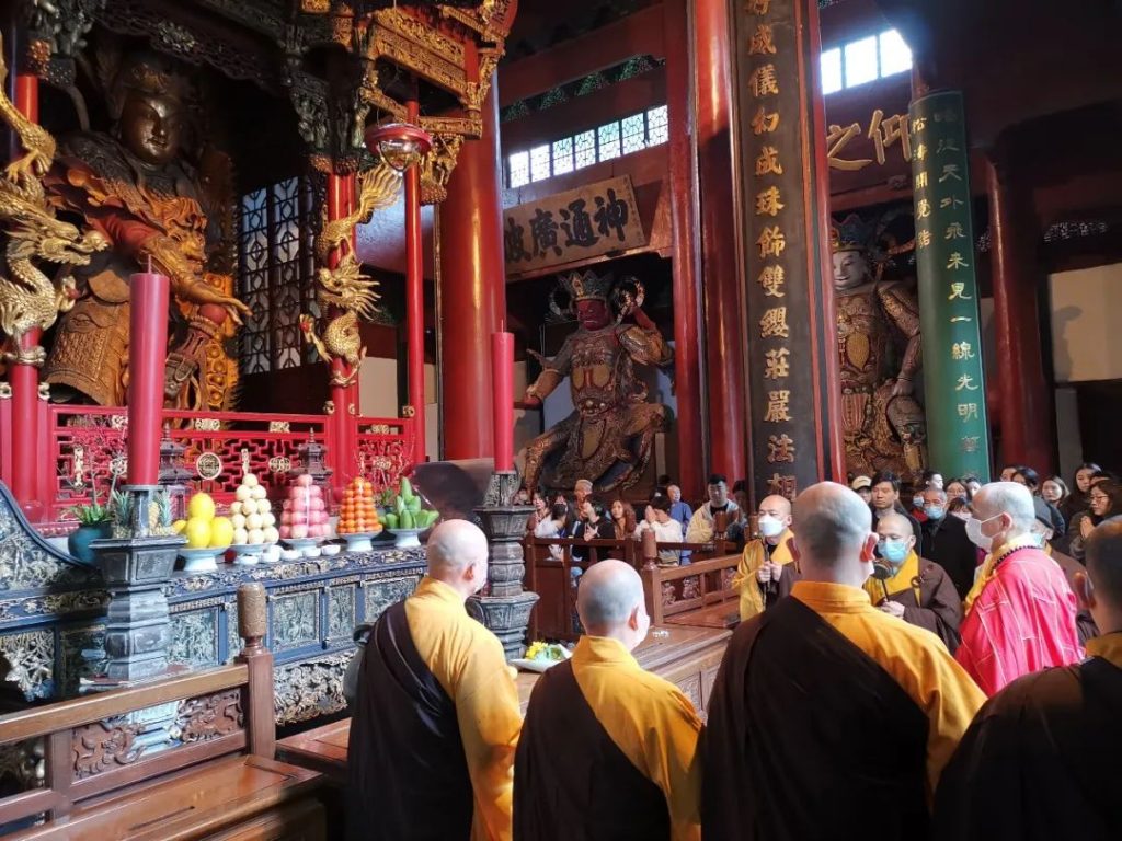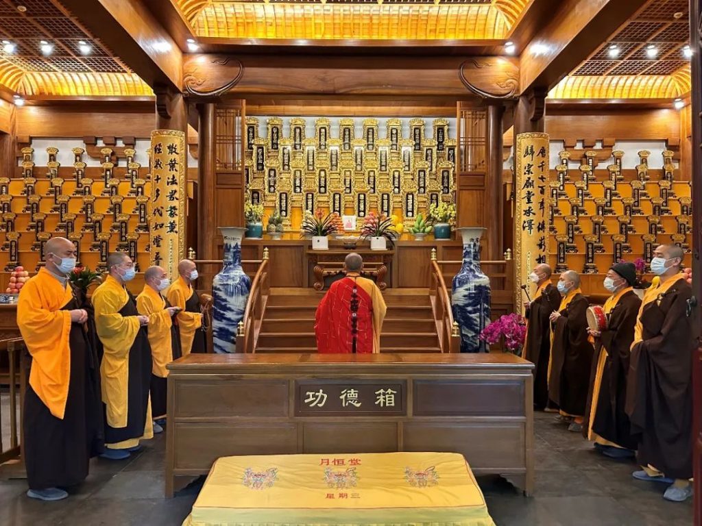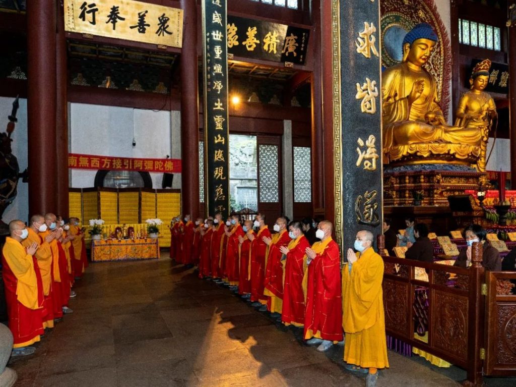 上午9时,灵隐寺两序大众齐集大雄宝殿,以香花果品、音声赞颂上供诸佛菩萨,同祈风调雨顺,国泰民安,法轮常转,佛日增辉。