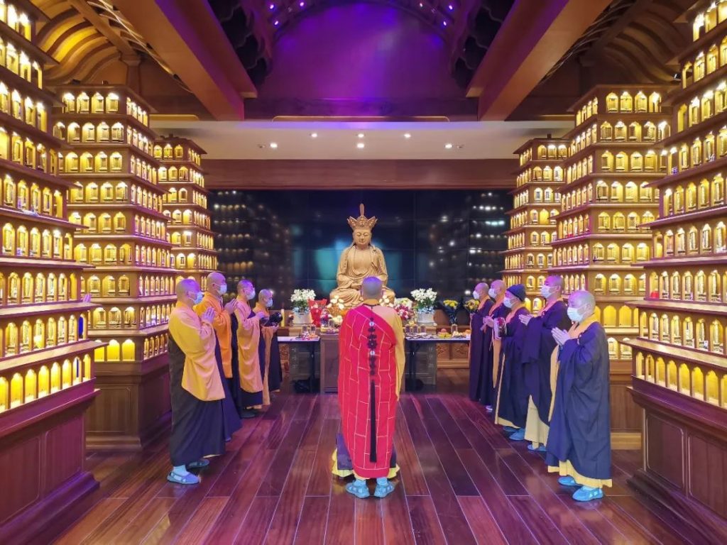 七天来,常住法师端恪一心,肃清三业,依科演梵,烧香散花,供养十方三宝,称唱诸圣洪名,仗千佛之威光,洗多生之罪垢。歌咏梵呗,忏罪称名,所集功德专伸回向,参与法会者及六道众生并诸眷属,现在者改往修来,福慧增长;已逝者闻法知返,径登莲邦!