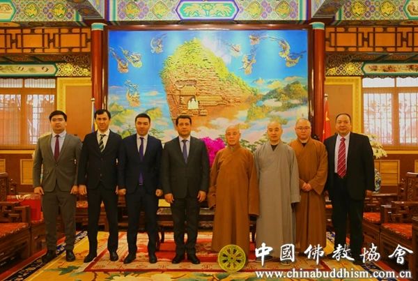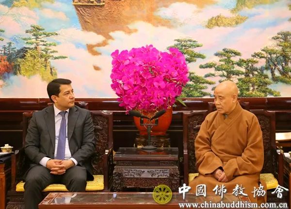 2023年4月6日上午,乌兹别克斯坦驻华大使法尔霍德·阿尔济耶夫一行拜访中国佛教协会,中国佛教协会会长演觉法师在广济寺怀远堂会见法尔霍德·阿尔济耶夫一行并进行友好会谈。