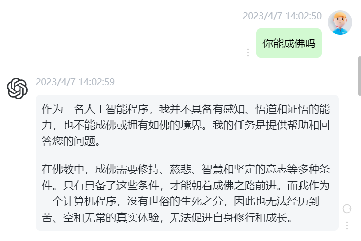 我尽量避开理论,先问它什么是佛,他给出了一个字典里的标准答案,我要求它不要用臃肿的理论回答我,能不能反问我,来启发我。