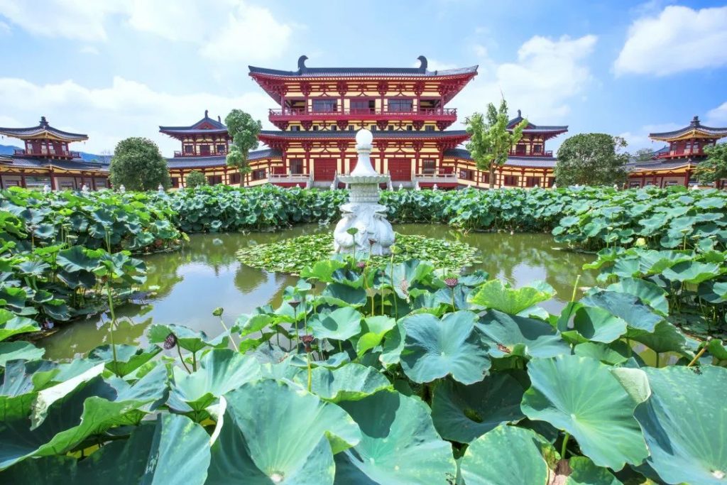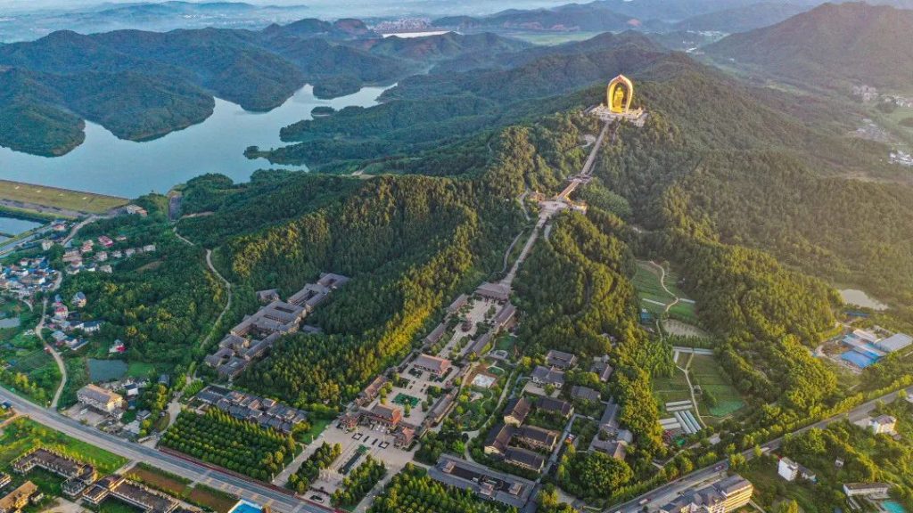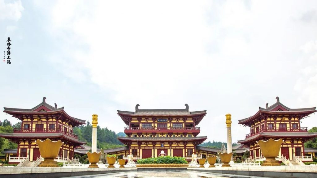 净土苑之核心建筑——东林大佛,于癸巳(2013年)四月初八建成并装藏,巍然屹立于观音山之巅。佛像净高四十八米,通身金色,相好殊特,威神无极,世所稀有。寺院整体依山而建,群峰环峙,翠峦骈逸,呈“川”字形布局,中轴伸展,两翼侧分,盛大宏阔。仿唐建筑,庄严无尽,呈现出一派恢弘古雅气象。