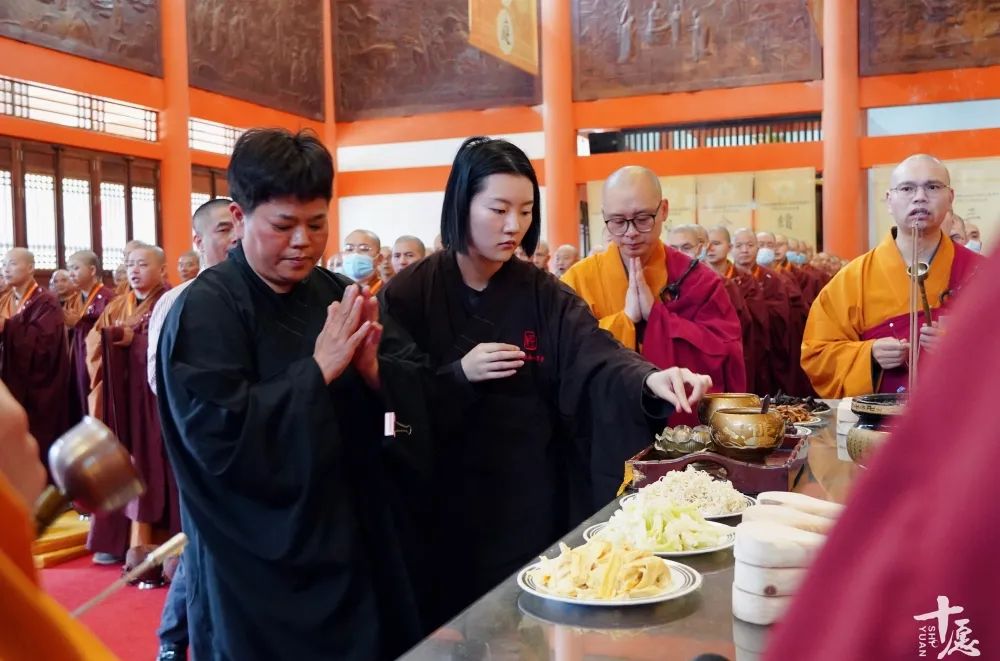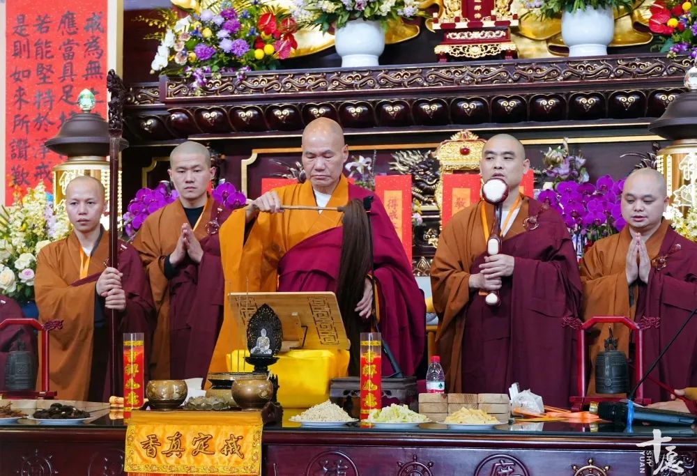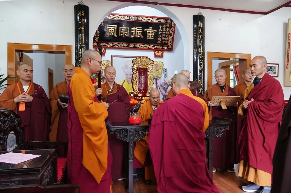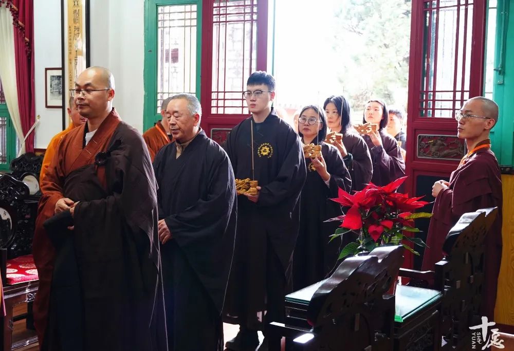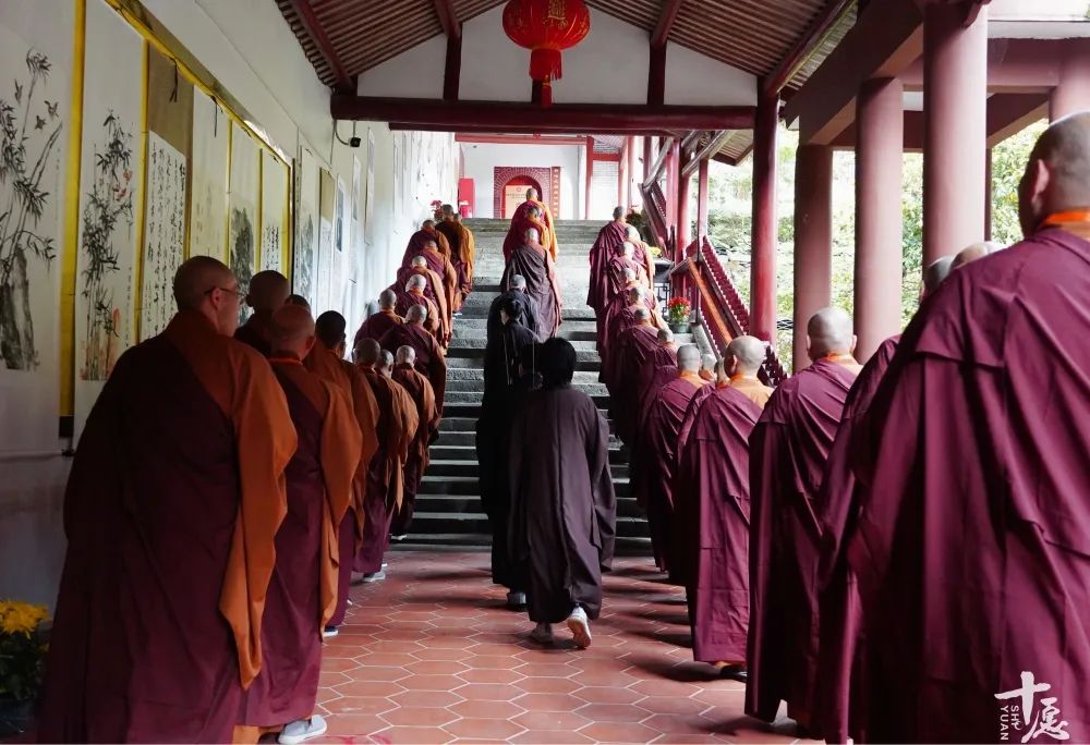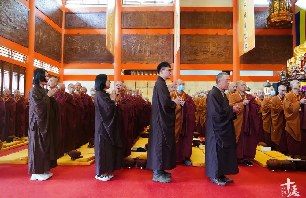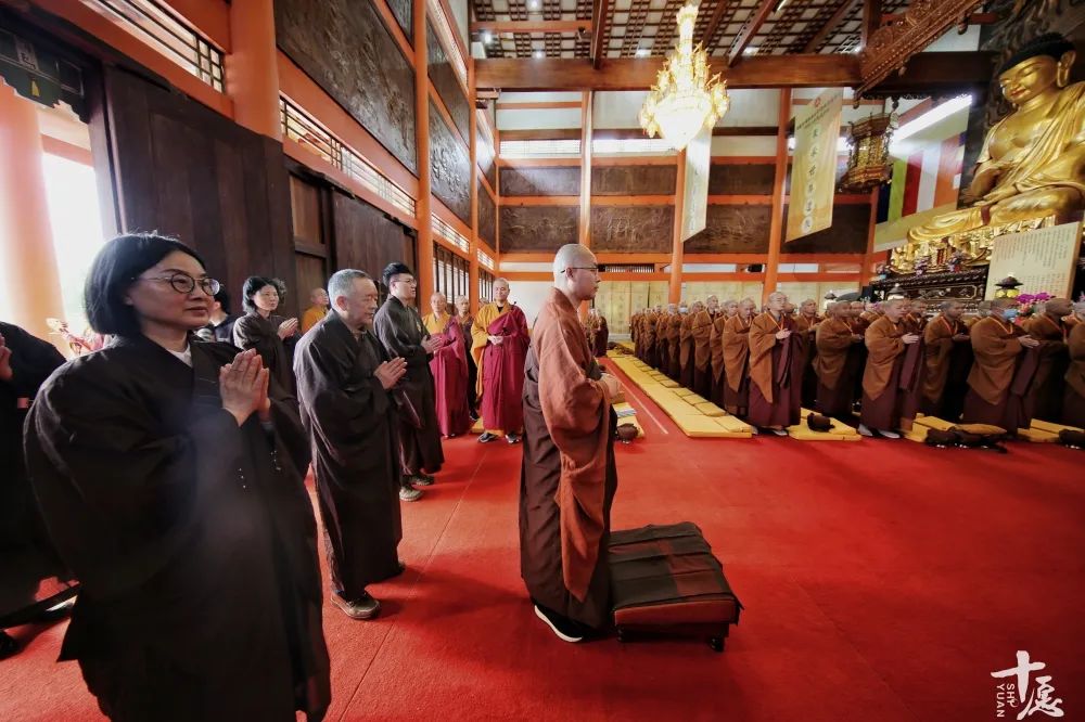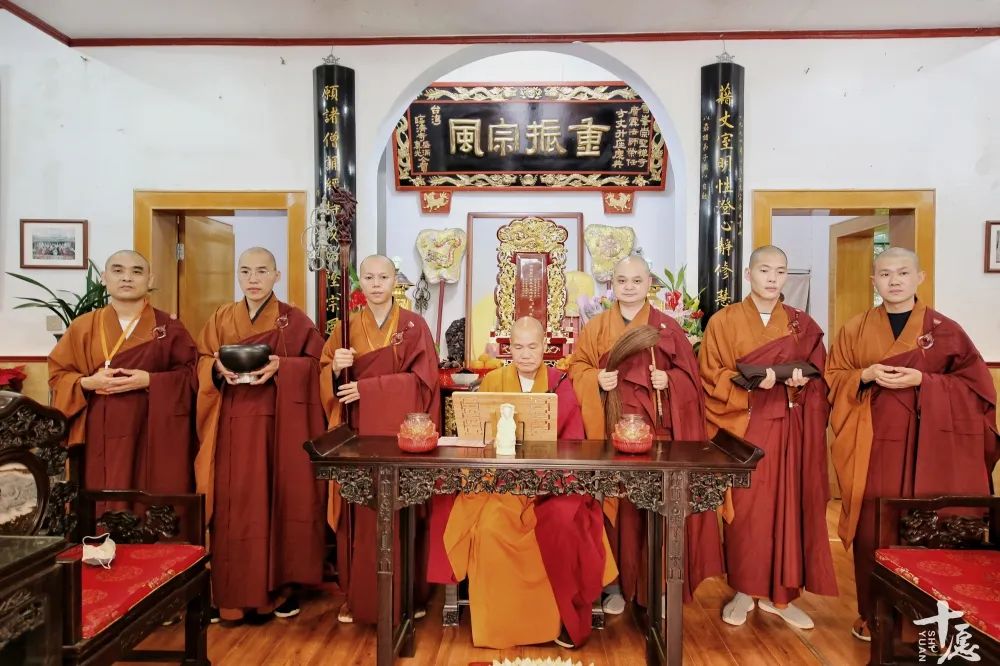 上午九点二十分,陪堂二师父、诸位引礼师引领众新戒及斋主前往丈室恭请开堂大师父能元法师上堂为斋主演说妙法,大师父慈悲应允。