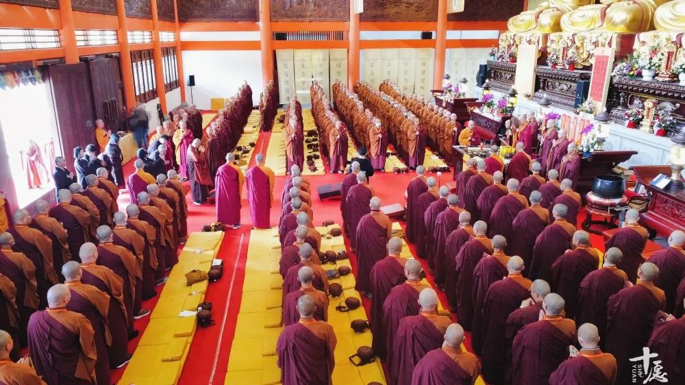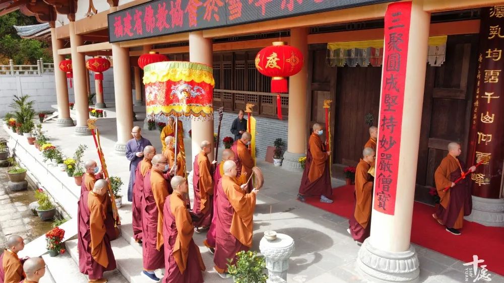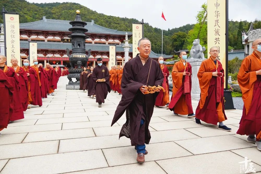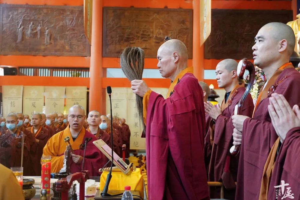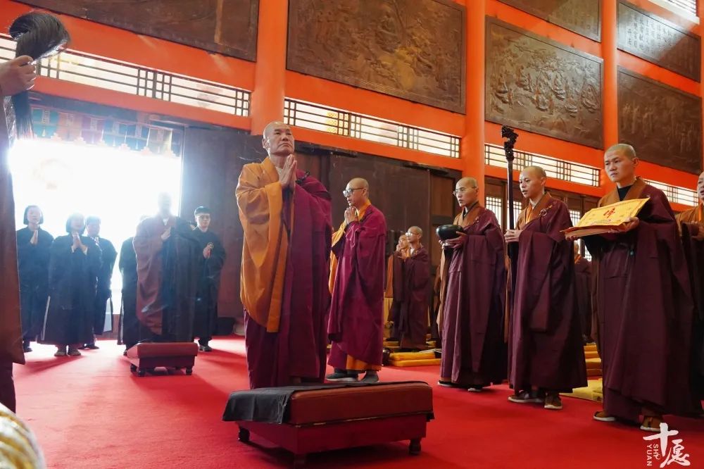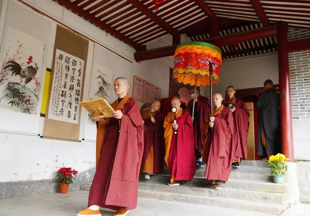 钟鼓齐鸣,龙天欢喜,大众闻高举幢幡宝盖,焚净香,将能元法师迎请至戒堂。