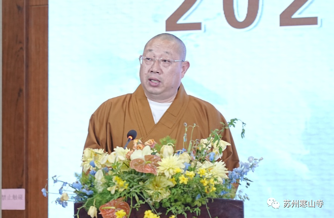 苏州民族宗教事务局副局长张莉女士在讲话中表示,本次研修班的成功举办,进一步搭建了书画艺术界和佛教界人士的桥梁和平台,也进一步搭建了苏州佛教与各地佛教书画艺术交流的平台。在积极推进宗教中国化的今天,苏州佛教界要以此次书法研修班为契机,充分发挥自身资源优势,积极挖掘佛教历史文化资源,丰富佛教文化艺术内涵,为实现中国式现代化苏州新实践作出贡献。同时,也希望各位法师不虚此行、学以致用,深入挖掘和阐释佛教文化艺术的时代价值,进一步增强文化自觉自信,积极弘扬中华优秀传统文化。