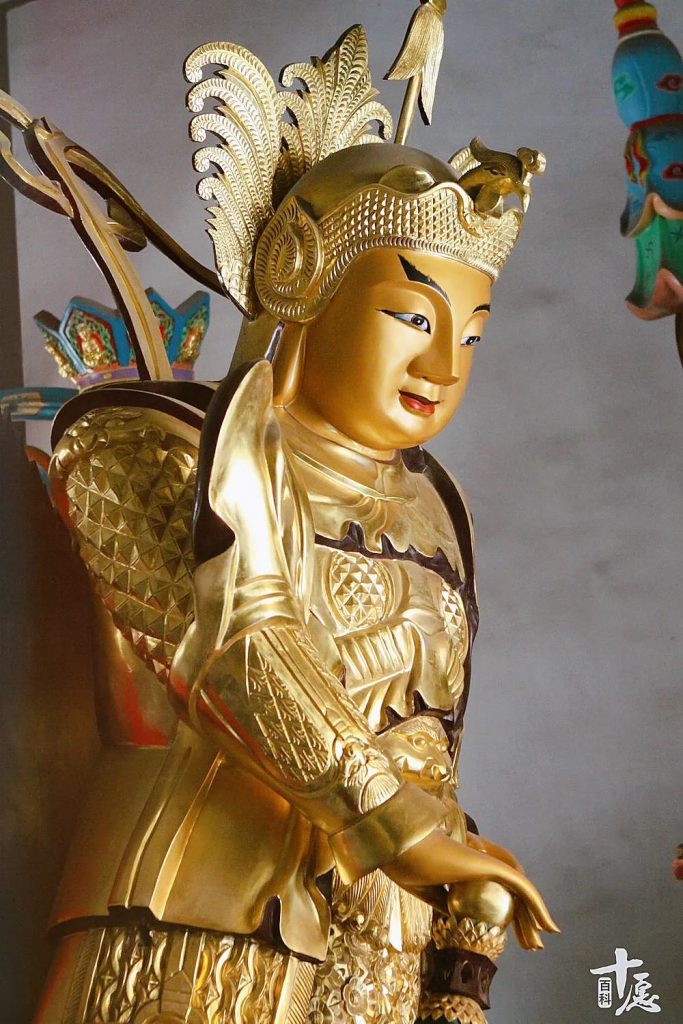 韦驮与弥勒佛背靠背,面向大雄宝殿,降魔伏鬼,保护佛法。该像一般为立像,两足平立,十指合掌,杵的位置则很有讲究: