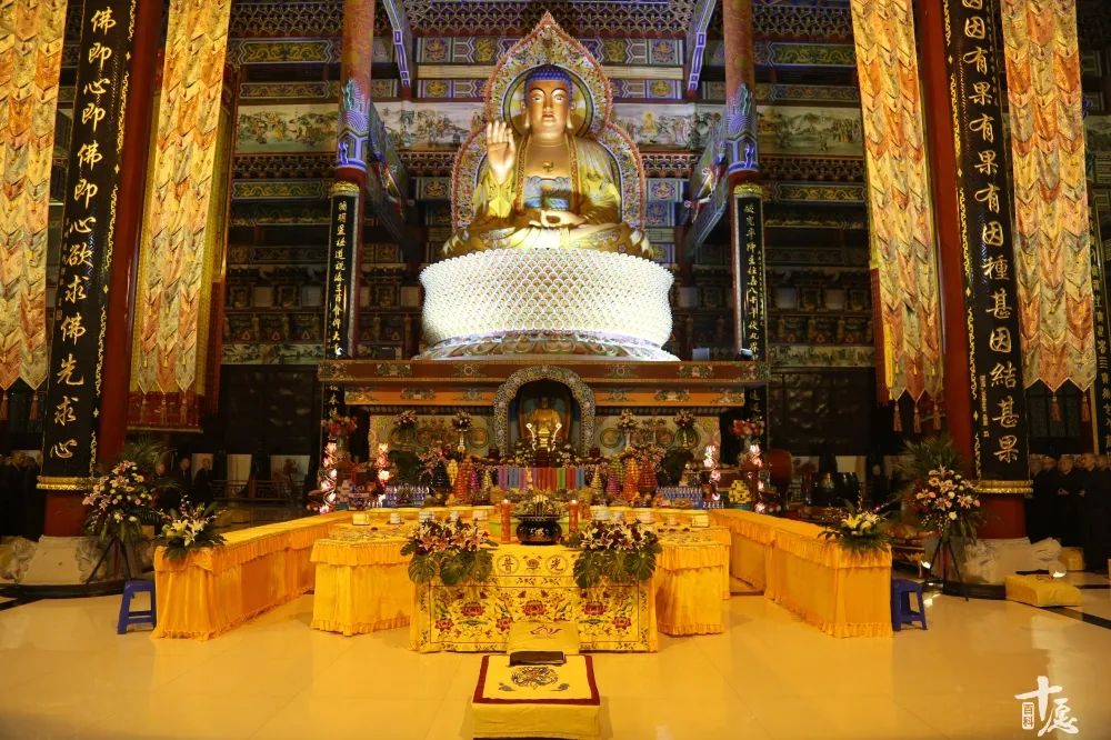 大雄宝殿中供奉本师释迦牟尼佛的佛像。“大雄”是佛的德号。“大”者,是包含万有的意思;“雄”者,是摄伏群魔的意思。因为释迦牟尼佛具足圆觉智慧,能雄镇大千世界,因此佛弟子尊称他为“大雄”。宝殿的“宝”,是指佛法僧三宝。