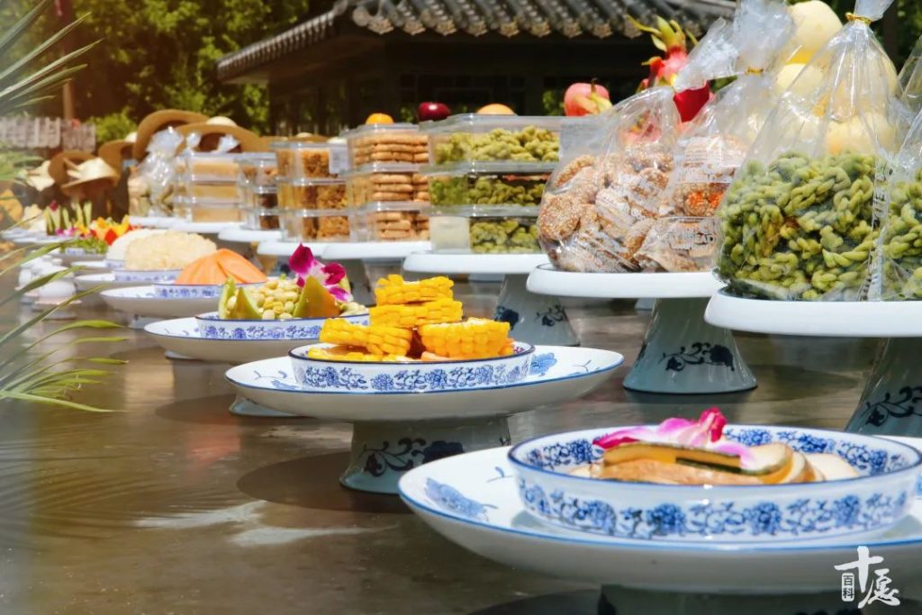 佛殿的佛像前设有供桌,桌上放着香花、时令瓜果、布施箱、佛灯等供物。据《法华经》佛前有十种供养:花、香、璎珞、秣香、涂香、烧香、幢幡、袈裟、技乐、合掌。