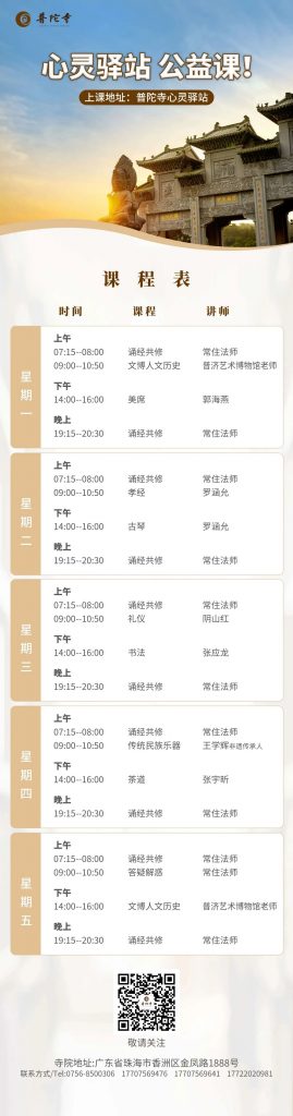 王老师会从最基本的乐理知识、识谱开始,指导大家使用乐器,学会基本的吹拉弹唱、打乐器的初级演奏。十二节课,如果全程跟下来,大众基本能掌握六首中外经典名曲。如:欢乐颂、小星星、生日歌、好人一生平安、爱的奉献、南无阿弥陀佛……在如此丰富的民族乐器课程里,大家来到心灵驿站,可以跟着非遗传承大师,藉由传统民族乐器的底蕴,见识民乐所深藏的中华气魄。