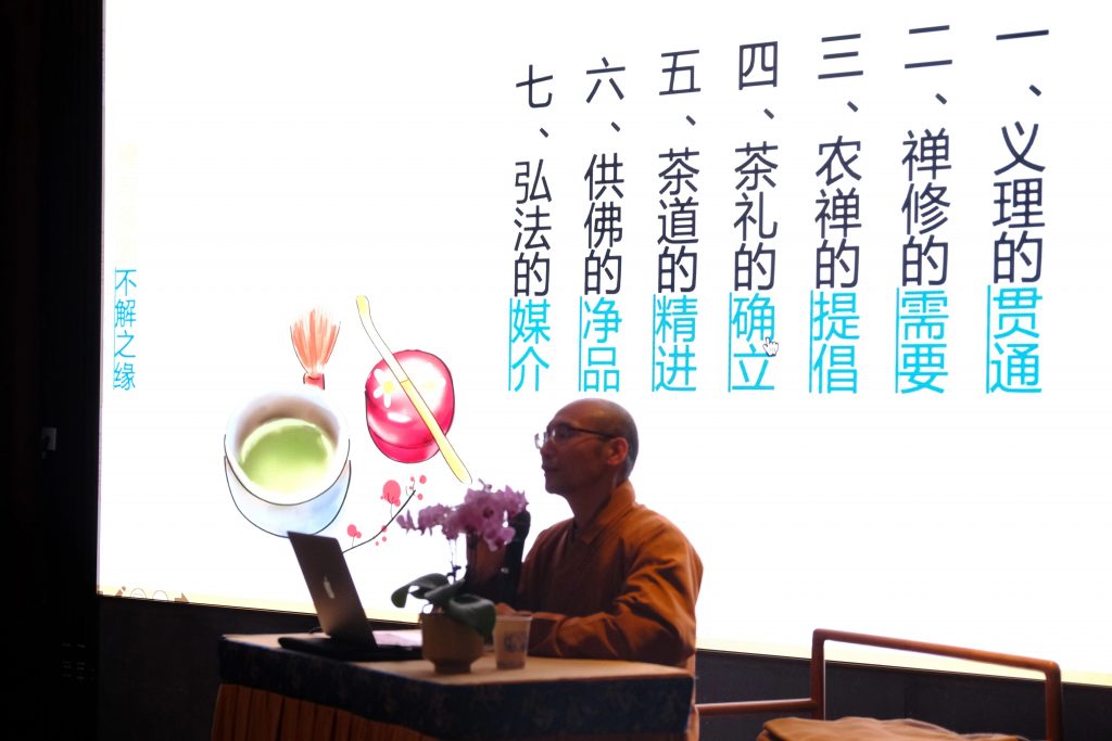 讲座共历时两天,分多场次于普觉讲堂阶梯教室及茶歇座谈交流。法师从禅茶的历史缘起、禅茶义理的贯通、禅茶对禅修的意义、佛教中国化农禅并重的特色、中日佛教茶礼的确立、径山寺禅院茶礼的意涵及禅茶的新时代意义作了系统性梳理和生动讲解。通过可潜法师两天深入浅出的授课,大家收获良多。