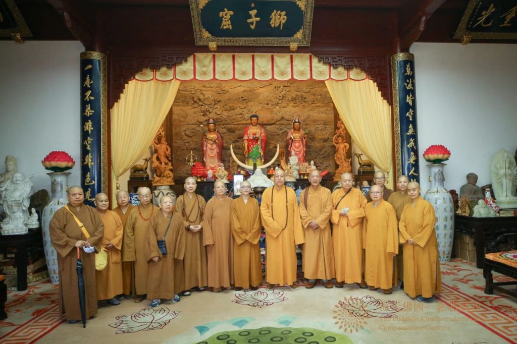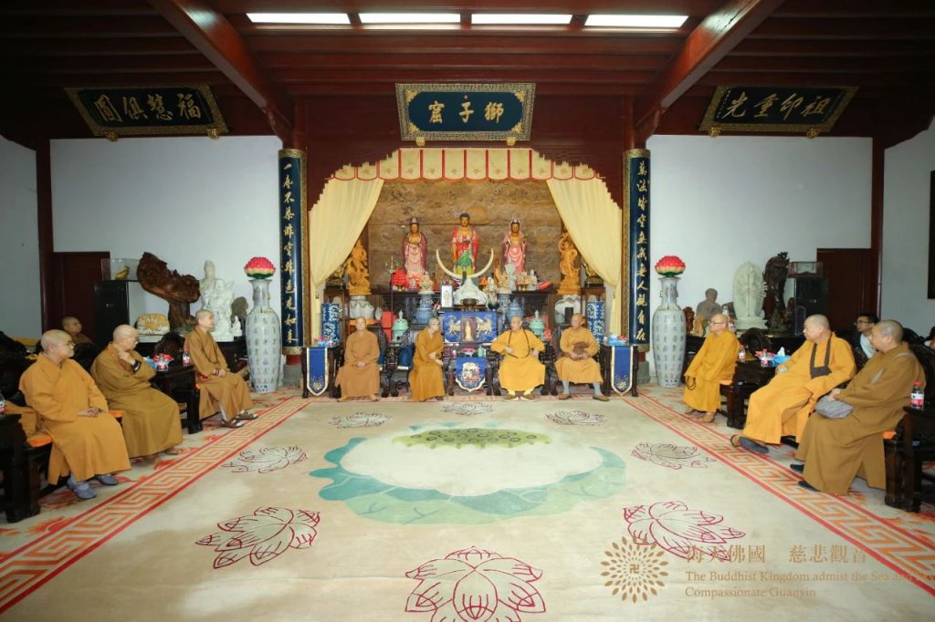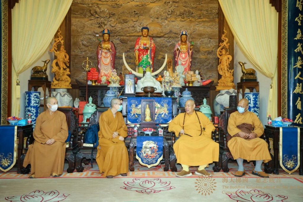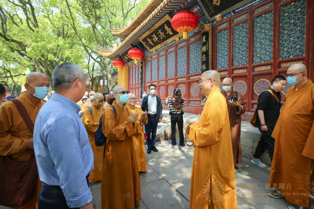 2023年5月14日,台湾南投县佛教会永久名誉理事长、常务理事、养谆佛学院院长、东方净苑住持体证法师一行到访普陀山参访交流。中国佛教协会副会长、普陀山佛教协会会长、中国佛学院普陀山学院院长、观音法界管理中心主任、普济禅寺方丈道慈大和尚在普济禅寺方丈殿热情接待了参访团一行。
