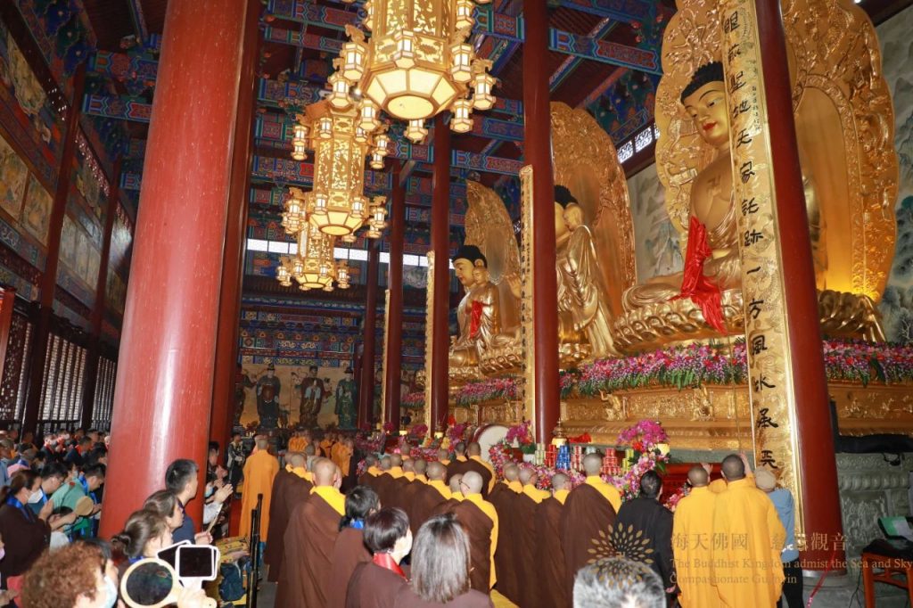 上午9时许,大雄宝殿落成庆典拉开帷幕,会长道慈大和尚带领诸山长老一道为开光法会拈香主法,迎请诸佛菩萨怜悯有情,分身现瑞,降临道场,居兹法座。法会现场,梵音嘹亮,庄严肃穆;诸师虔诚念诵,恭敬威仪。在阵阵祝福声中,开光法会圆满,以此殊胜功德,祈愿佛菩萨慈力加被,世界和平、人民安乐、国运昌隆;正法久住、海众安和、善信吉祥、福慧增长。