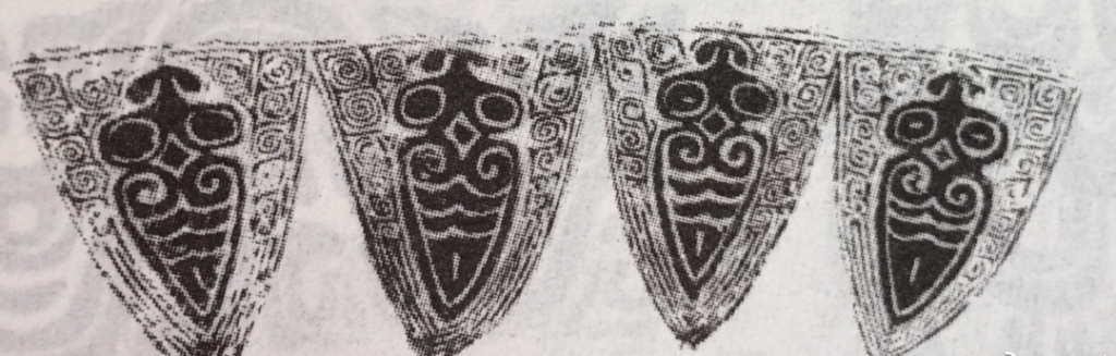 当时常见的青铜蝉纹,包括三角的垂叶形状等,有的腹部还形象表现出一节节条纹。