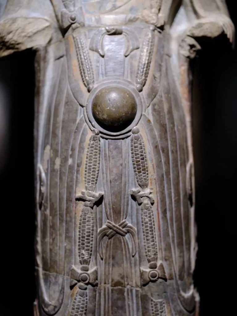 虽然双臂缺失,但菩萨肩膀完好,衣带自双肩下垂,交叉处闪耀着一颗硕大宝珠。