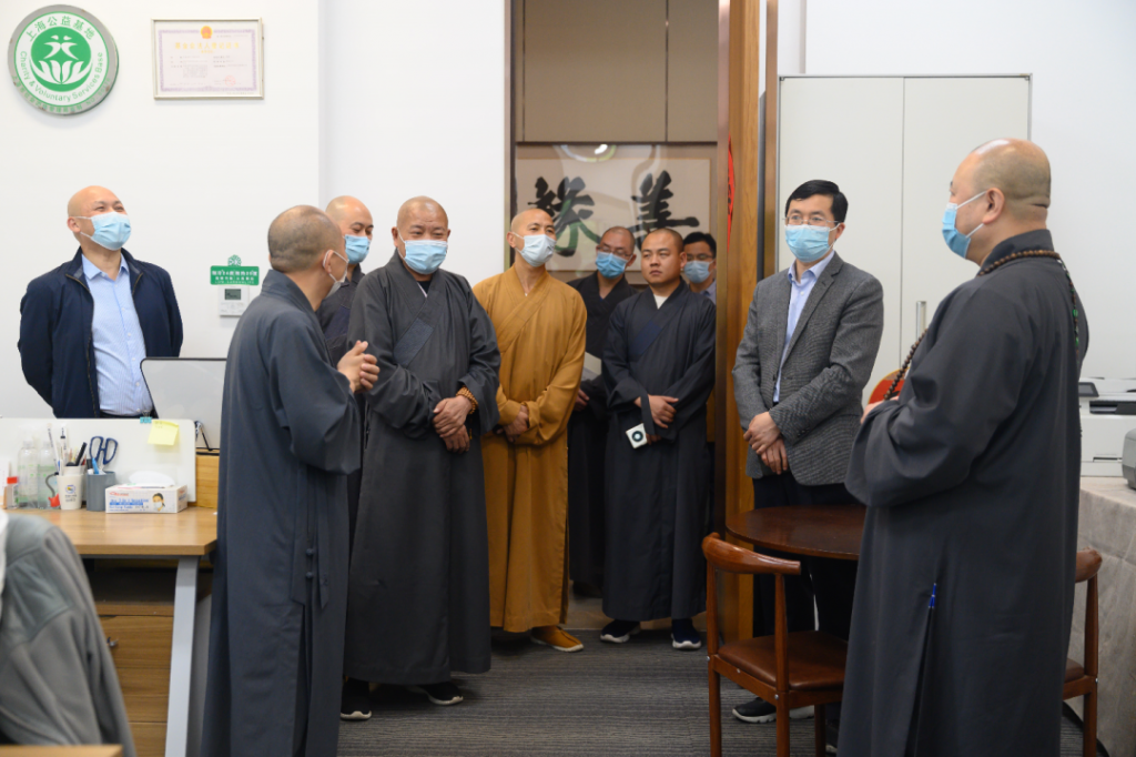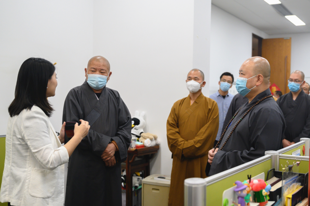 2023年5月24日,江苏省民宗委宗教一处处长刘克元,江苏省佛教协会会长秋爽大和尚等一行到访上海玉佛禅寺调研信息化建设工作。