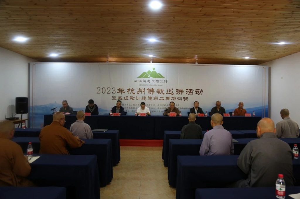 5月25日,由杭州市民族宗教事务局、建德市民族宗教事务局指导,杭州市佛教协会、建德市佛教协会、桐庐县佛教协会、淳安县佛教协会共同主办,杭州市佛协建德教职人员培训点、建德玉泉寺承办的“之江问道·正行正行”——2023年杭州佛教巡讲活动暨区级轮训建德第二期培训班在建德玉泉寺举行。建德市市委常委、市委统战部部长 郑泽挥,建德市民宗局局长龚志坚,杭州市佛教协会会长月真法师,杭州市佛教协会副会长、建德市佛协会长演通法师,杭州市佛教协会秘书长胡胜军、常务副秘书长邓安松,桐庐县佛教协会会长莲愿法师,淳安县佛教协会会长志祥法师等出席开班仪式。开班仪式由志祥法师主持,演通法师、月真法师、郑泽挥先后致辞讲话。