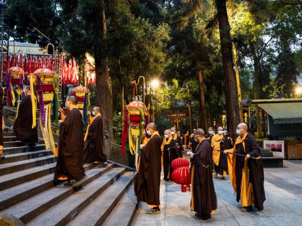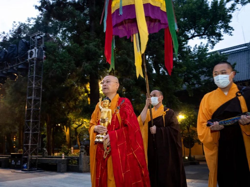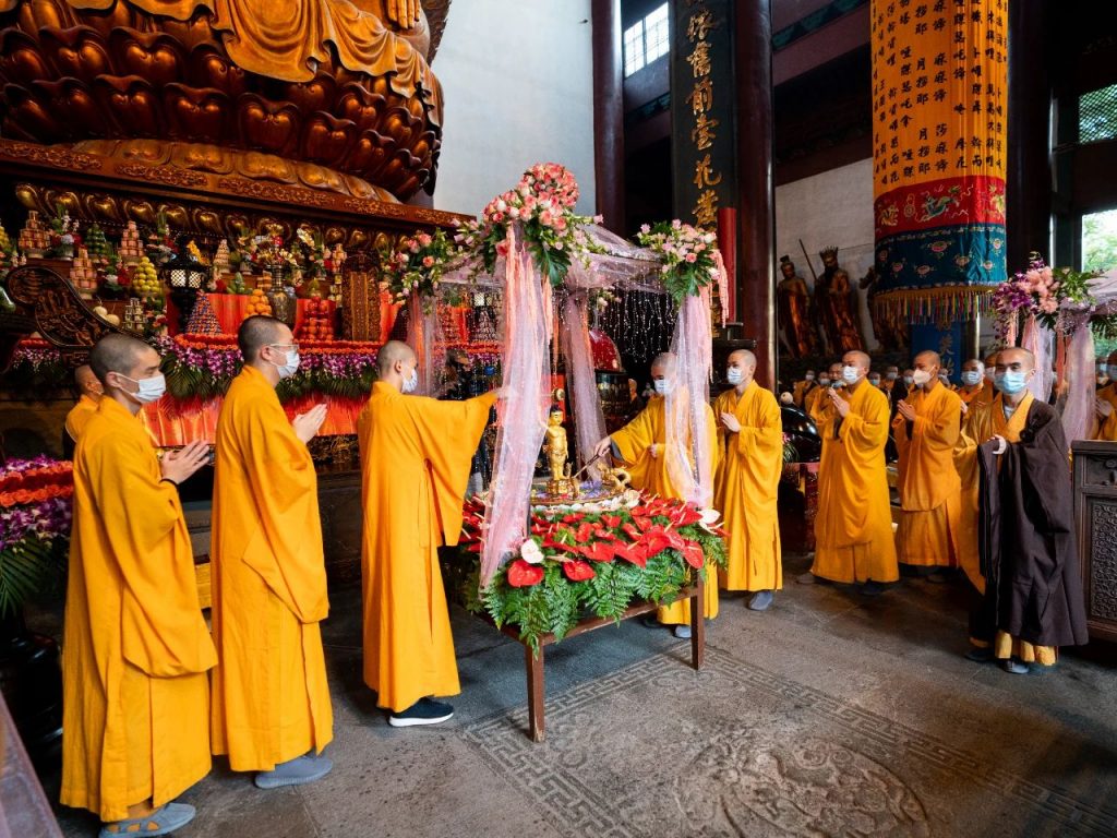 凌晨四点四十五分,杭州灵隐寺两序大众搭衣持具,整齐排班,闻磬声向上顶礼三拜后,同声称念“南无本师释迦牟尼佛”圣号,仪仗出班前往客堂,恭迎悉达多太子圣像。灵隐寺方丈光泉大和尚率众将太子像恭迎至大雄宝殿,安座于满盛香水的九龙金盆之中。