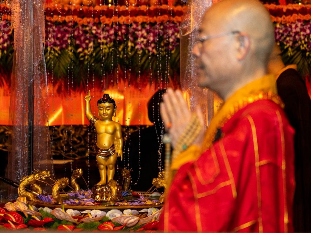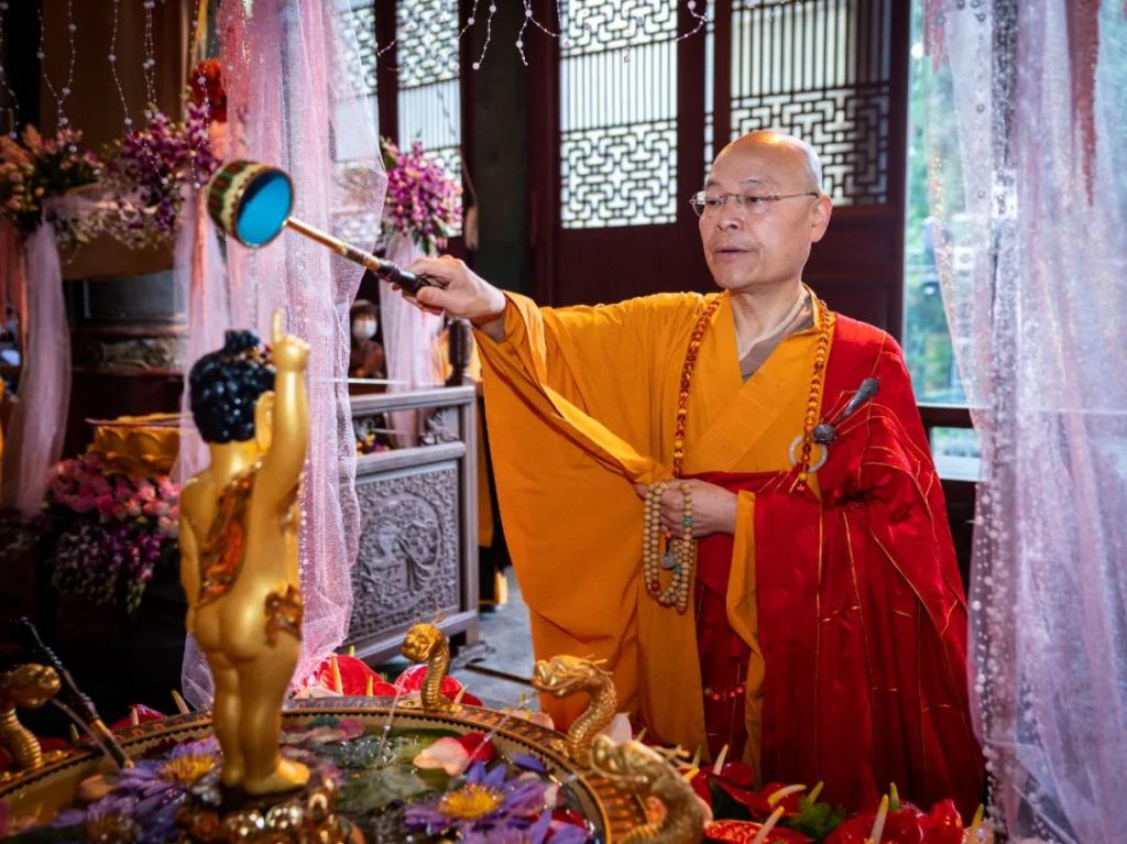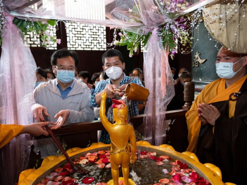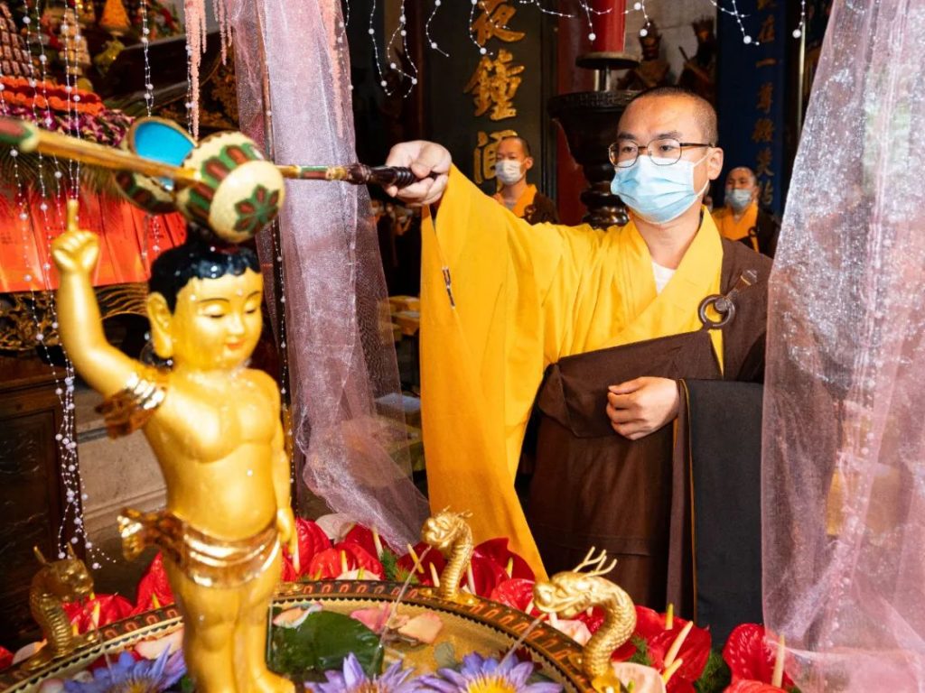 大众至诚称念“南无本师释迦牟尼佛”圣号,光泉大和尚用小勺舀香汤三勺灌沐太子金身,而后大众分班依次浴佛,共祈国运昌隆、正法久住,法界众生永离烦恼尘垢、速证清净法身!