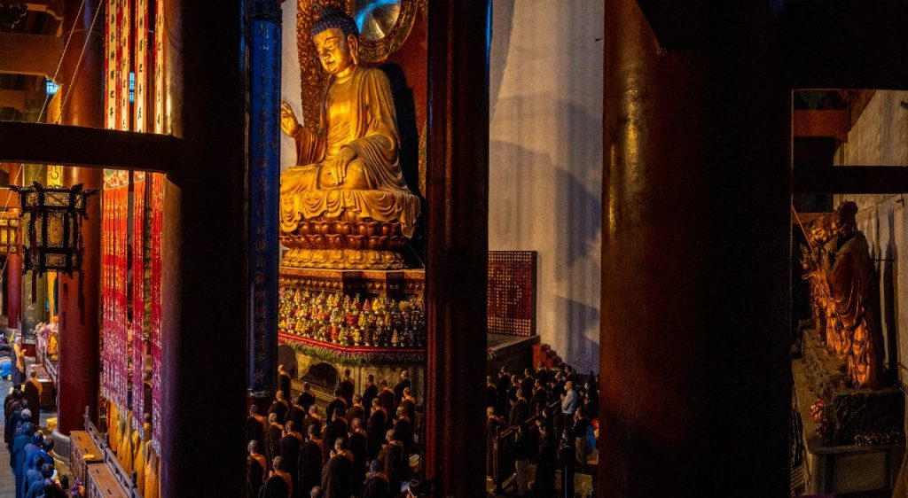 大雄宝殿内经声佛号,梵唱清扬,四众弟子同心感念本师释迦牟尼佛慈航倒驾,降迹娑婆,苦海作明灯,照破千年暗夜;人天同欢喜,妙法普度群生。