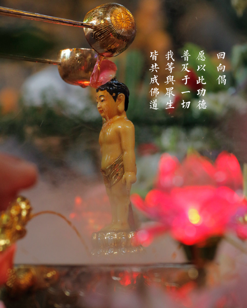为感念佛陀深恩厚德,庆祝佛诞良辰吉日,后世佛弟子于每年农历四月初八进行浴佛,以纪念佛初诞生时的情景。《浴佛功德经》云:“由作如是浴佛像故,能令汝等人天大众,现受富乐,无病延年;于所愿求,无不遂意;亲友眷属,悉皆安稳;长辞八难,永出苦源;不受女身,速成正觉。”