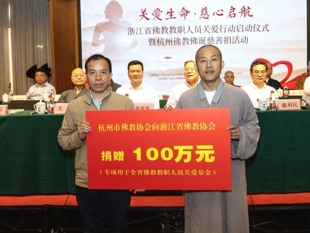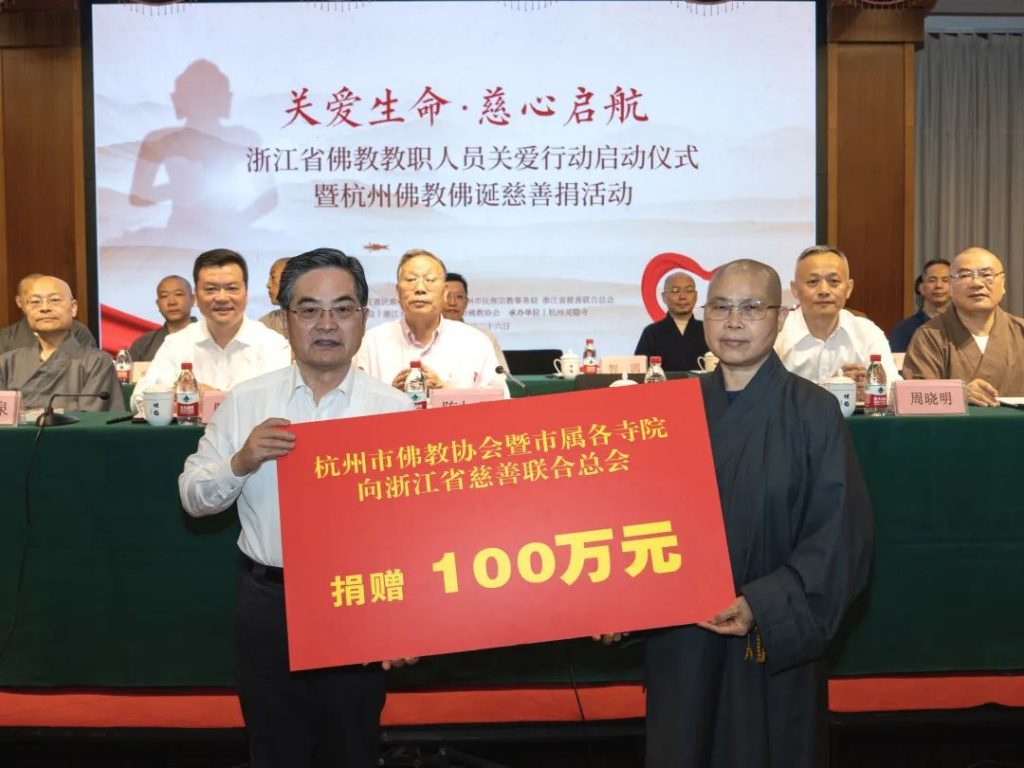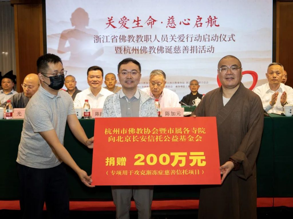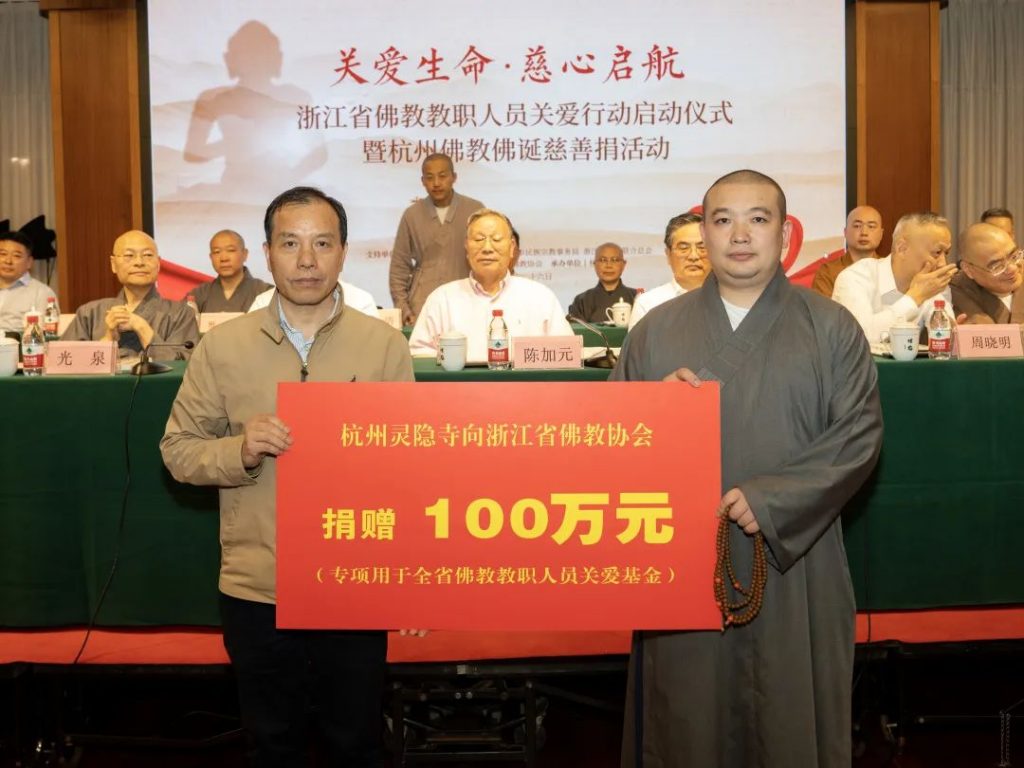 2023年5月26日(农历四月初八),适逢佛教传统节日佛诞节,“关爱生命·慈心启航——浙江省佛教教职人员关爱行动启动仪式暨杭州佛教佛诞慈善捐活动”在杭州灵隐寺举行。杭州市佛教协会和杭州灵隐寺分别向浙江省佛教协会全省佛教教职人员关爱行动专项基金捐赠人民币100万元。