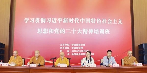 为全面深入系统学习贯彻习近平新时代中国特色社会主义思想和党的二十大精神,中国佛教协会于2023年5月29日至6月2日在中国佛学院凤凰岭校区举办佛教教职人员培训班。培训班由中国佛学院承办。5月29日下午培训班举行开班式,中国佛教协会会长、中国佛学院院长演觉法师出席开班式并讲话。中央统战部有关部门负责人、中国佛教协会副秘书长宏度法师、中国佛学院副院长清远法师等出席活动。开班式由中国佛教协会副会长、中国佛学院常务副院长明海法师主持。