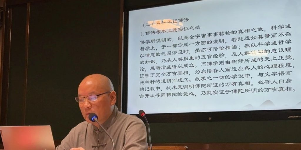冯焕珍教授不仅将太虚大师浩如烟海的著作和毕生的“新佛教”事业做了提纲挈领的总结,还对其中关键要点进行精到的评述,在短短两小时内将太虚大师见行的精华进行了高度提炼。首先,冯教授总结太虚大师一生就做了一件事——弘扬佛法,这可谓是对太虚大师一生功业的精到评价。第二,太虚大师说“必吾人自身亦开发等同佛陀的觉心,乃能实证于佛陀所明的万有真相”,冯教授进一步指出,若信仰纯正但不能体证,便只能守护如来家业(遗法),唯有能够体证才能真正光大遗法;第三,冯教授从太虚大师“从不冀成为学者”的自述谈到佛教义学研究应有意培养以学术的方式来传递信念的能力,以成就自修化他、觉人救世之方便;第四,太虚大师指出,佛教的目的是令一切众生成佛,以此纲领提持五乘佛法、八宗纲要,不是为了分立门墙、“分河而饮水”,而是为了契理契机;第五,太虚大师指出,佛教对人乘有无量利益,是“即边中之人生,遂变成极活泼自由,极圆满平等之宇宙人生”;第六,太虚大师深刻分析了汉传佛教在唐以后衰落的六大原因,冯老师依此总结,不依国主为支持则佛法很难振兴,不依纯正佛法为中心则正教很难崛起;第七,“真现实论”的究竟解读可谓是“无主义主义之现实主义”,“唯佛陀为无主义主义之现实主义者”;第八,1928年太虚大师提出“新佛教”之破、改、建,包括改超荐的佛教为服务利人的佛教,以“人生佛教”的理念来整理原有僧寺,来建立适应现实环境的佛教僧伽制度等;第九,太虚大师反对隐遁消极的佛教精神,是为了说明积极奉行人生佛教,而非反对人出家修行;第十,太虚大师谈自己“非一宗徒裔”,是为了破门户之见,非破除宗派。比如念佛法门不是法外之法,不宜孤取念佛法门而破斥其他大乘法门等等。