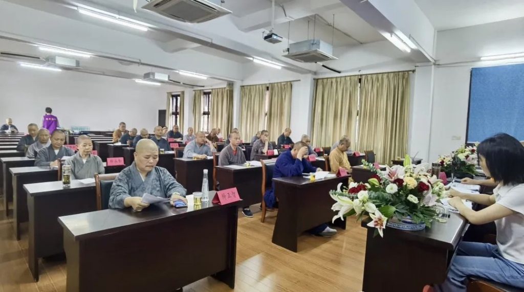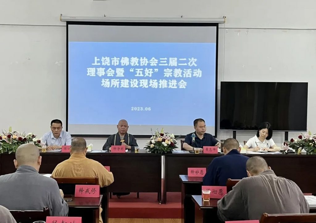 2023年6月27日上午,上饶市佛教协会三届二次理事会暨“五好”宗教活动场所建设现场推进会在广丰区香山寺会议室召开。