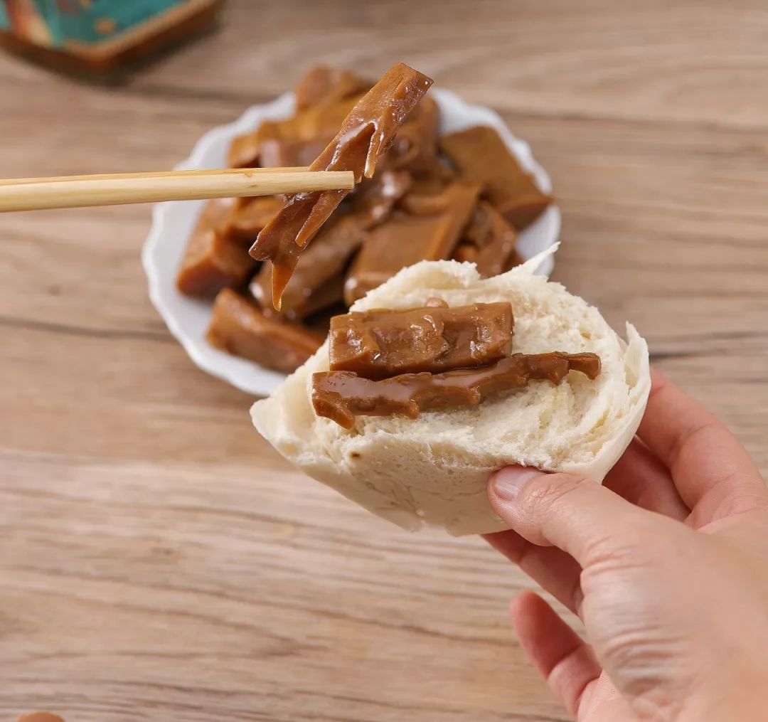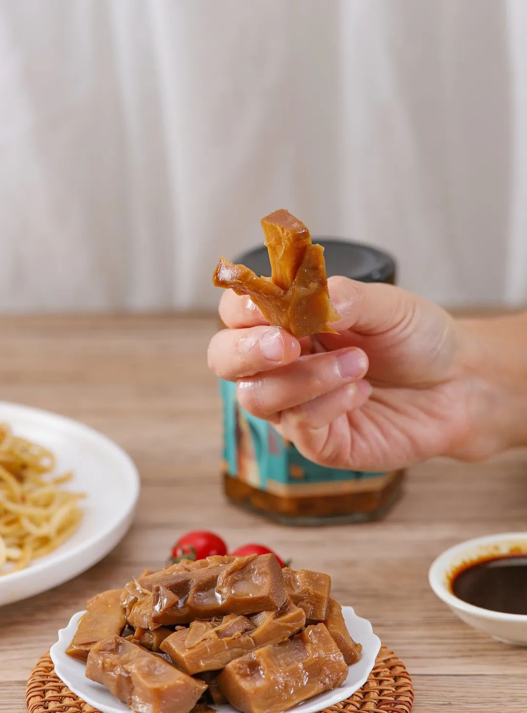 咀嚼,外软内脆,酱汁丝丝渗入,咸香嫩滑,