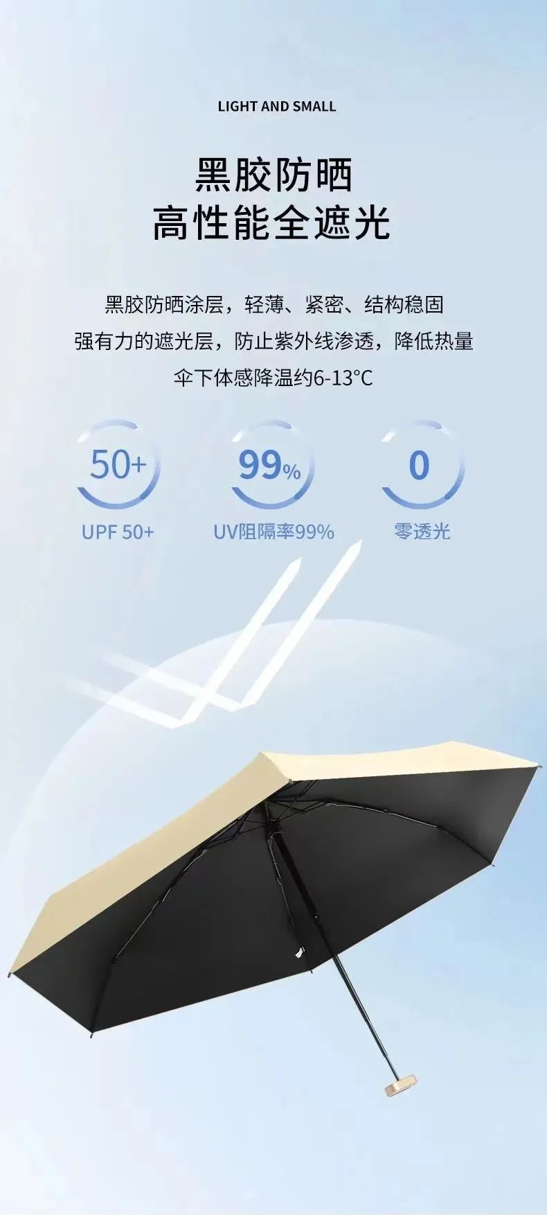 而我们这款迷你六折黑胶防晒伞,外层采用高密纤维伞布+内层防晒伞特用的黑胶防晒涂层制成的,