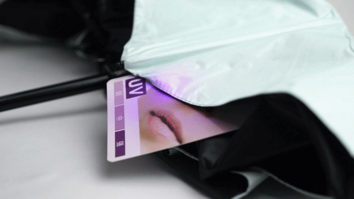 裸露在外的卡片瞬间被紫外线灯晒成紫色,而防晒伞保护到的地方还是白白净净,没有半点紫外线穿透的痕迹!