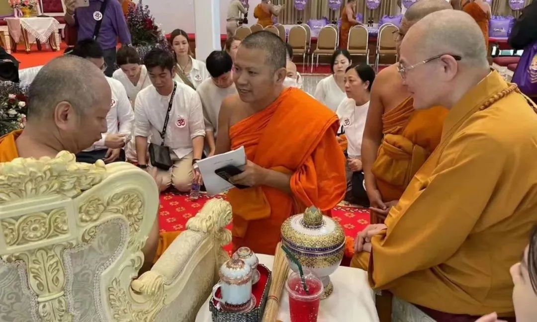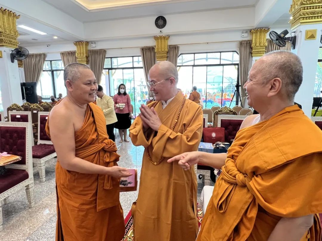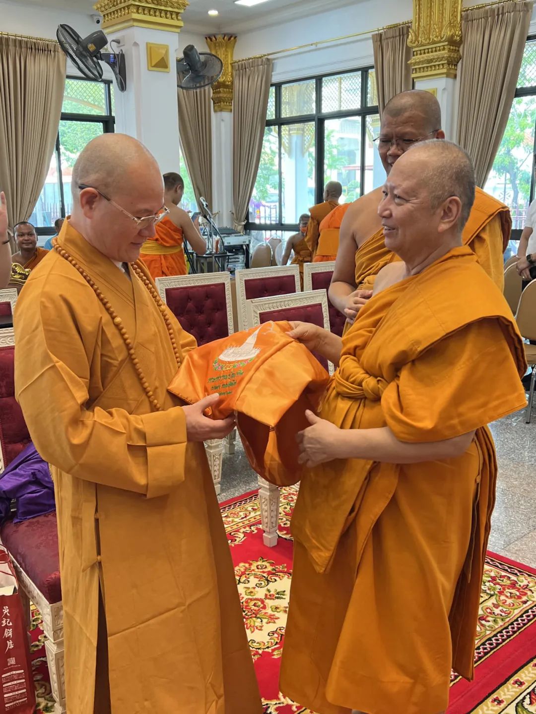 9月17日上午,泰国大乘佛教研究中心主任、福建省佛协常务副会长、福建佛学院院长、福州开元寺方丈、莆田广化寺方丈本性法师一行,参访泰国并代表泰国大乘佛教研究中心专程前往泰国曼谷帕荣寺为泰国最高僧伽委员会委员、联合国卫塞节国际理事会主席、国际佛教大学协会主席、摩诃朱拉隆功大学前任校长梵智长老的寿辰送上至诚的祝福,祝福长老长寿健康。本性法师还亲书寿字墨宝敬赠,梵智长老欢喜接受。