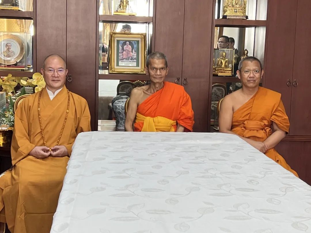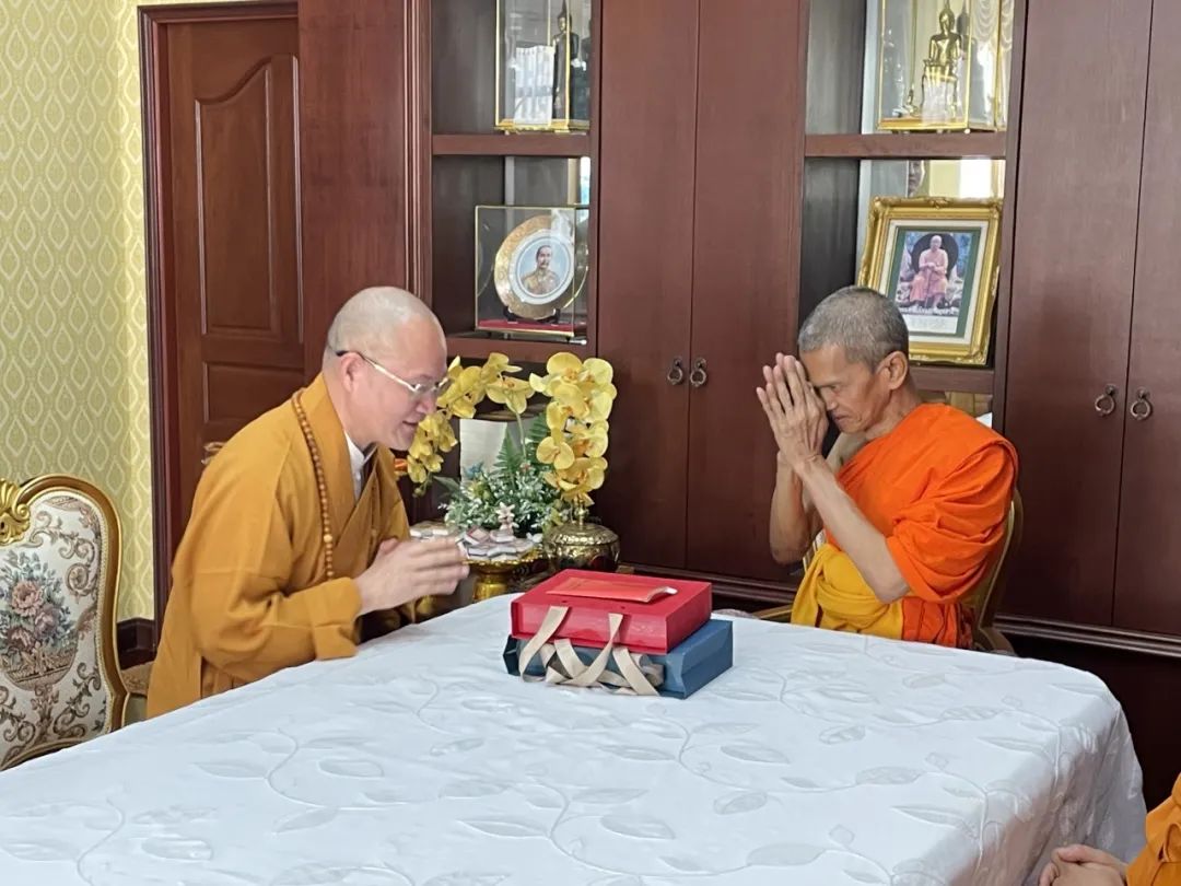 本性法师一行还前往曼谷黎明寺专程看望老朋友沙威长老,两人回忆长期以来的交流合作,相谈甚欢。