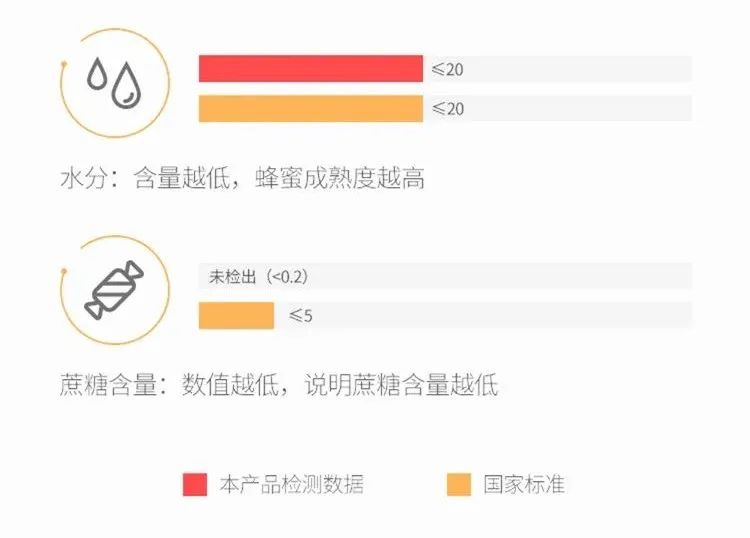 而且根据《行业标准蜂蜜》,这款四川白蜜含水量只为20%,符合一级品≤20%的标准,蔗糖也被转化成了葡萄糖和果糖,是自然好蜜。