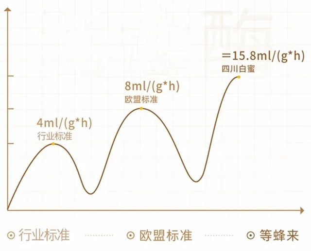 同时,未经过高温浓缩处理,四川白蜜也保留了酶的含量。经检测,四川白蜜淀粉酶含量有15.8ml/(g·h),高于欧盟标准(注:蜂蜜淀粉酶行业标准≥4ml(g·h),欧盟标准≥8ml(g·h)。)