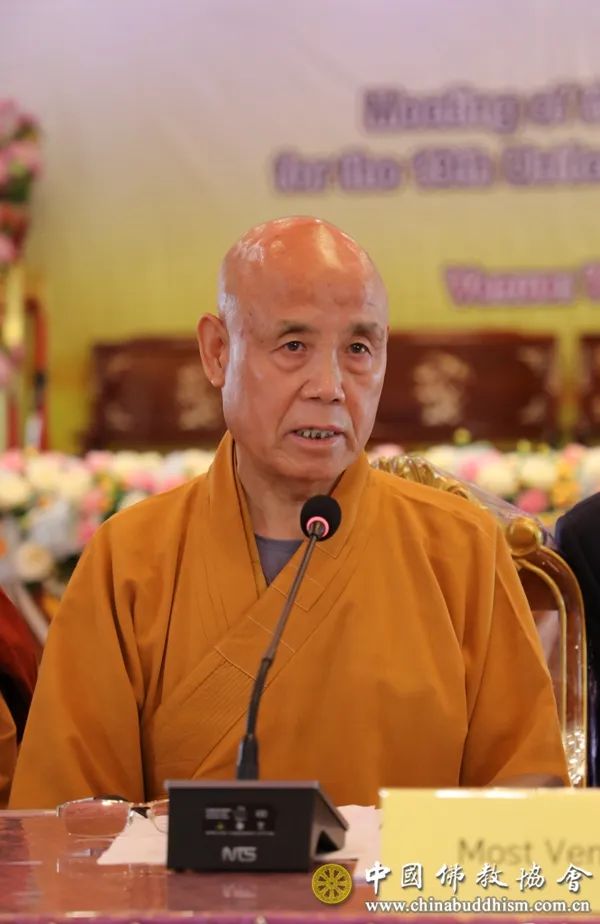 演觉会长在会议发言时表示,联合国卫塞节庆祝大会是世界各国各地区佛教徒进行友好交流的重要平台,每年举行的庆祝大会对各国各地区佛教的发展和弘扬,对法门兄弟的团结和互助起到了重要的作用。中国佛教界每年都派代表团出席联合国卫塞节庆祝大会,在此也非常感谢联合国卫塞节国际理事会对中国佛教事业的支持。今后,中国佛教界也希望继续加深和拓展与联合国卫塞节国际理事会的交流与合作,为世界各国各地区佛教的传播与发展,为世界和平与人类福祉作出积极贡献。