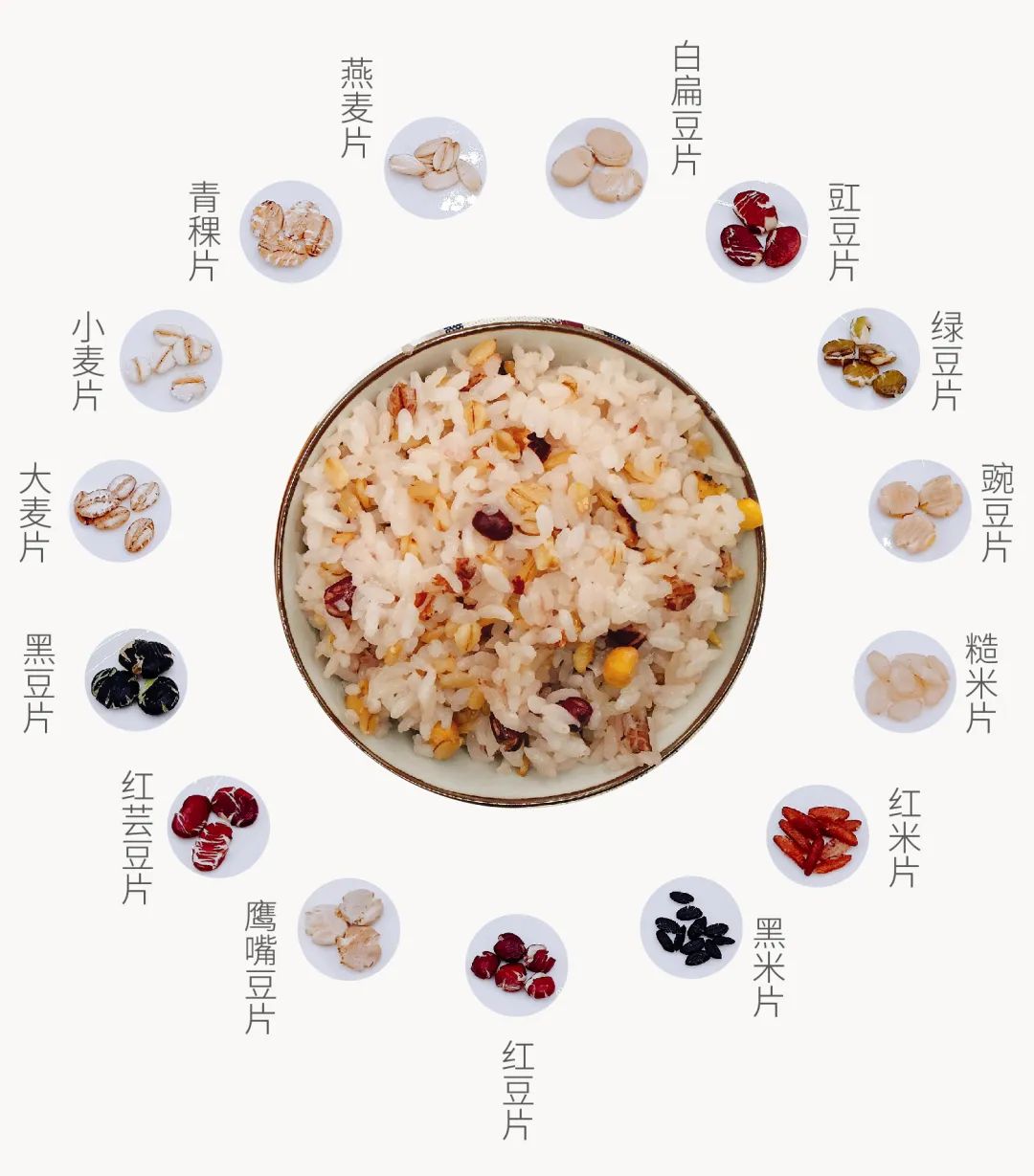 原粮原粒预熟压扁,不用提前浸泡,和大米同煮同熟,菜炒好就能直接开餐。