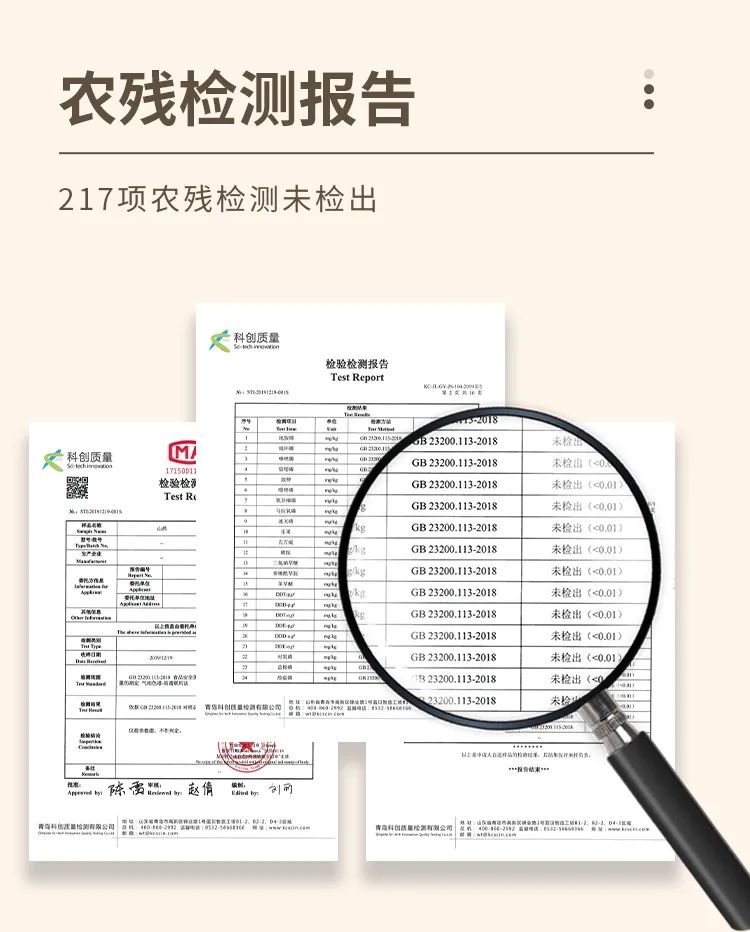 10年种一茬的土壤本肥沃,耕种时只用农家肥给予养分,不打农药,不打膨大剂,任其自然生长,这样严格耕种的标准才是正宗小白嘴山药。并且专业机构检测217项农药未检出,品质更放心。
