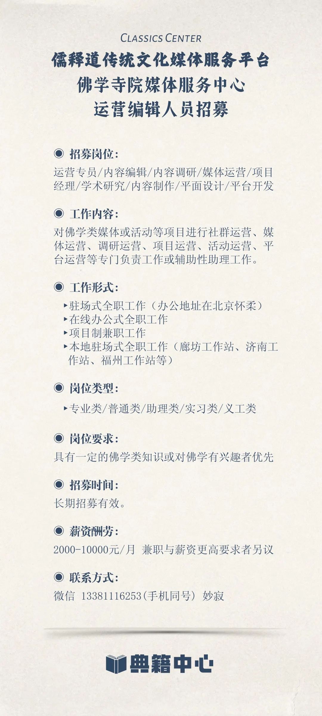 对佛学类媒体或活动等项目进行社群运营、媒体运营、调研运营、项目运营、活动运营、平台运营等专门负责工作或辅助性助理工作。