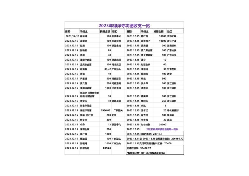 此次所募善款,账目全部公开,专款专用。欢迎监督,每一笔善款都会记载在修缮绵洋寺功德簿内,永久存档,流芳千古,特此倡议。