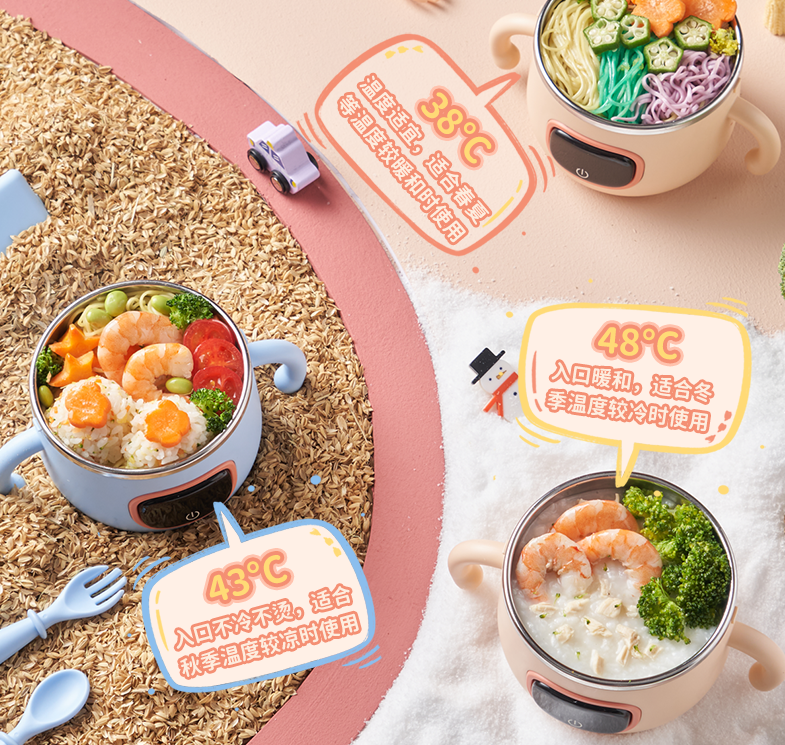 一旦加热,整个碗保持在38-42℃,宝宝吃饭再慢,碗里的粥或饭还会一直保持温热。