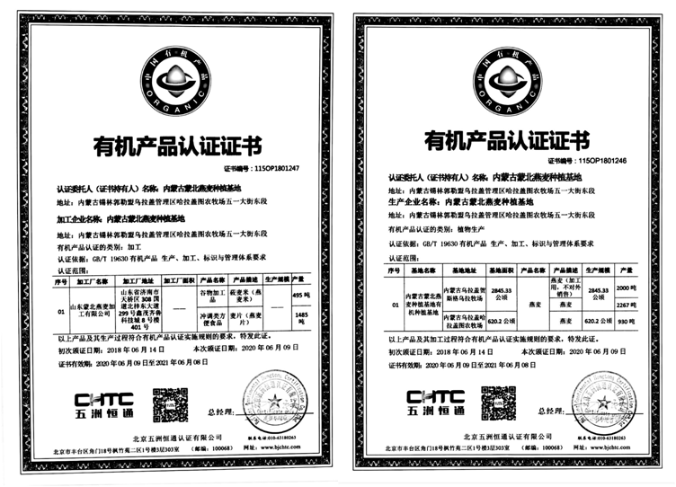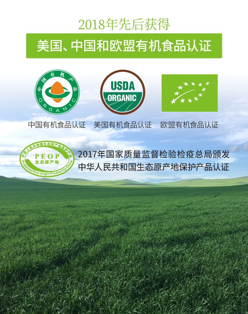 ▲2018年,蒙北燕麦先后取得中国、美国、欧盟三国有机认证