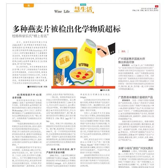 ▲《新快报》报道:多种燕麦片被查出化学物质超标