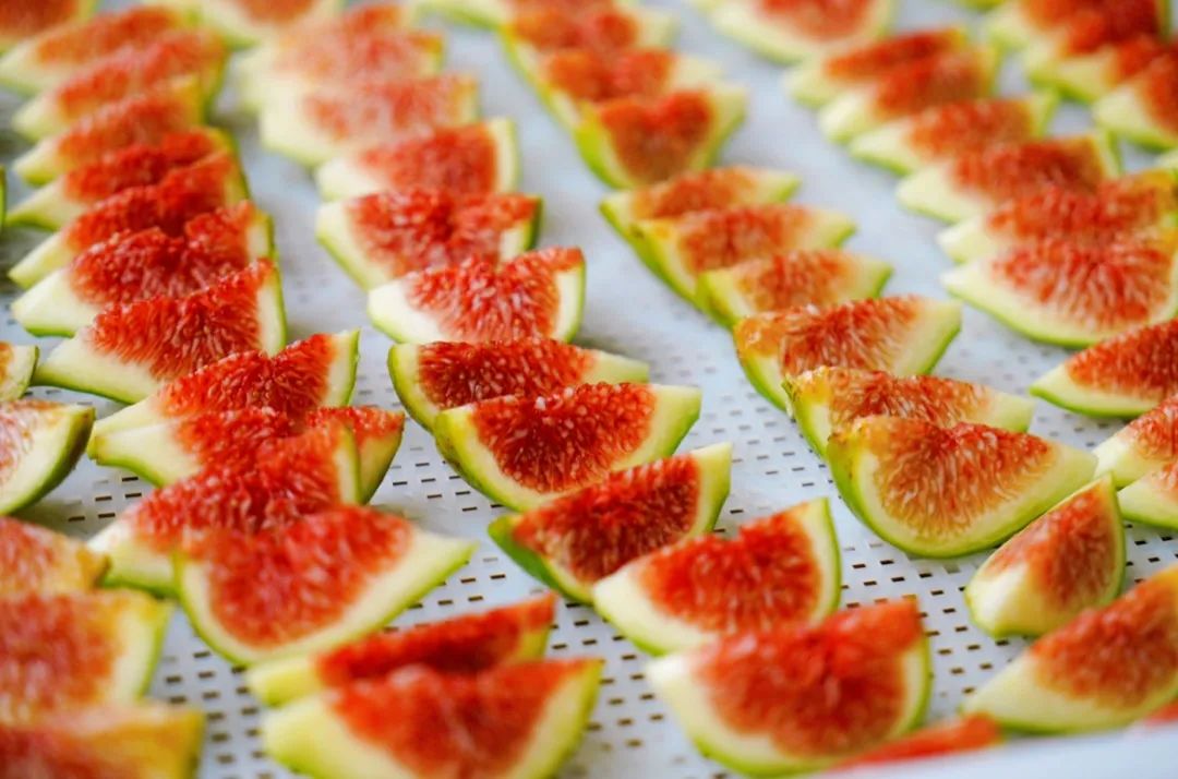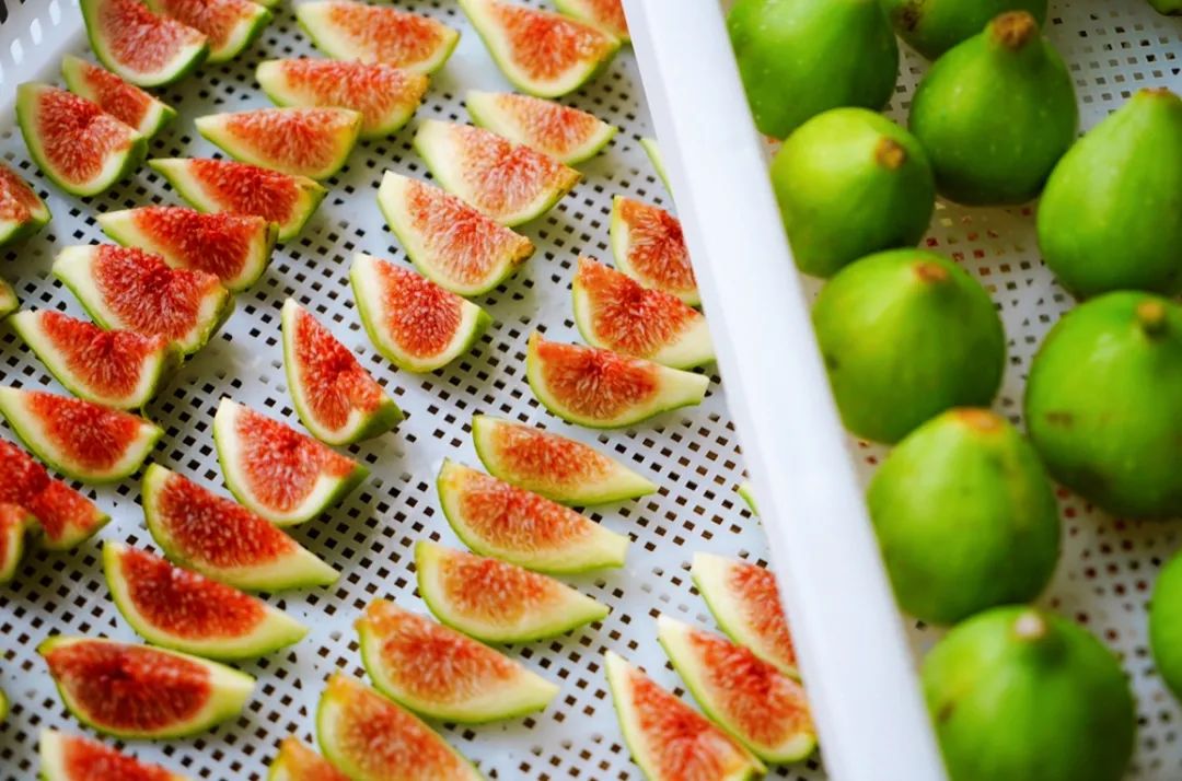 成熟的无花果采摘下来,要先剔除坏果、残果和其他杂质。清洗干净后,切除果柄,再分切成4-6小块,这样能加大果肉的干燥面,节约干燥时间,减少果干的营养和口感损耗。