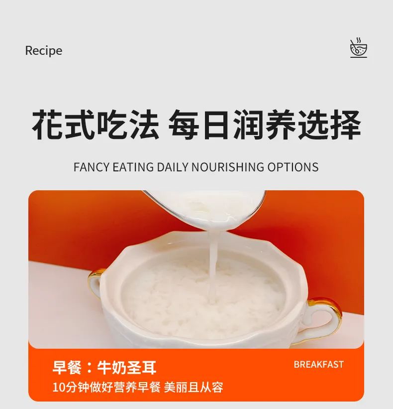 比如你早上起床先焖上,之后再去洗漱,收拾完时间刚刚好。出门前吃上一口软糯鲜香的银耳羹,一整天都是元气满满的。