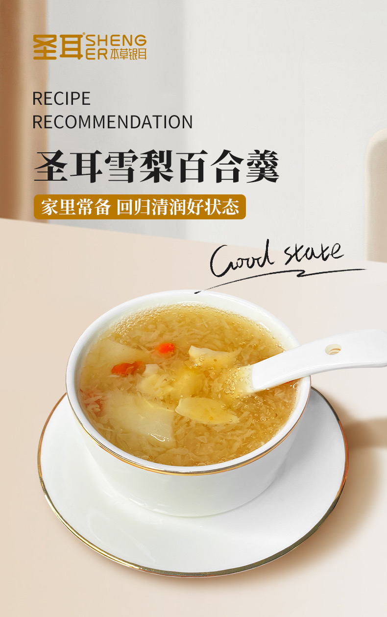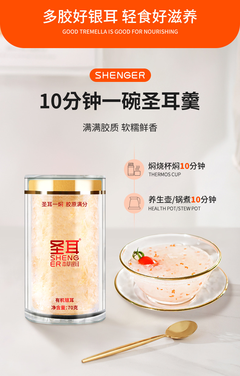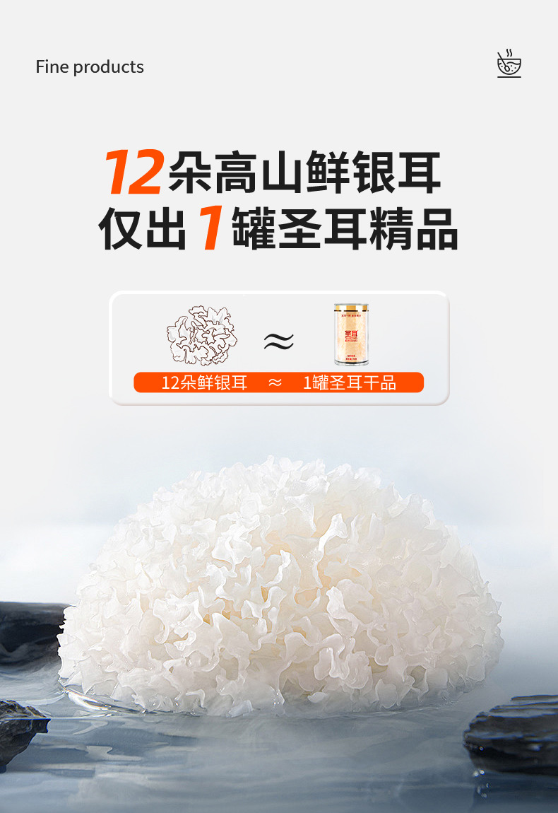 所以,它是“吃”着滋补食材的精华营养长大的。而且,“喝的”都是天然高山泉水,连空气湿度都严格把控。极大程度上还原了“白如银,形如耳”的高品质原生形态。所以,圣耳的营养远超市面上的银耳品质口感。