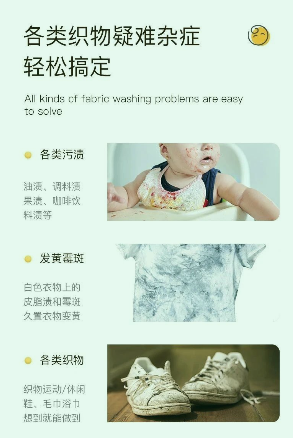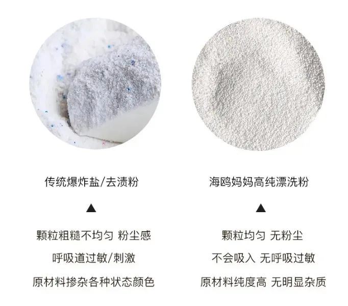 看到这里肯定有人说,怎么听起来像“爆炸盐”?那你可太小看它了,市面上普通的爆炸盐都是过碳酸钠掺洗衣粉,很多为了降低成本还添加了工业盐和工业碱,不仅效果一般,漂洗困难,还容易残留一堆有害物质。更有一些,带着粉尘,对呼吸道还有严重的刺激性。