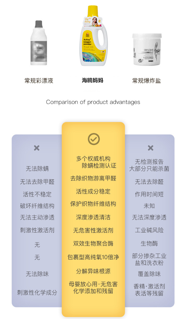 除霉、去渍、护色、漂洗一次搞定,自从有了海鸥妈妈,家里省下了漂白剂、柔顺剂等七七八八的瓶瓶罐罐。一瓶海鸥妈妈·泡洗粉≈衣服清洁剂+卫生清洁剂+厨房清洁剂+除 螨液+杀 菌液+甲醛清洁剂,一举六得!